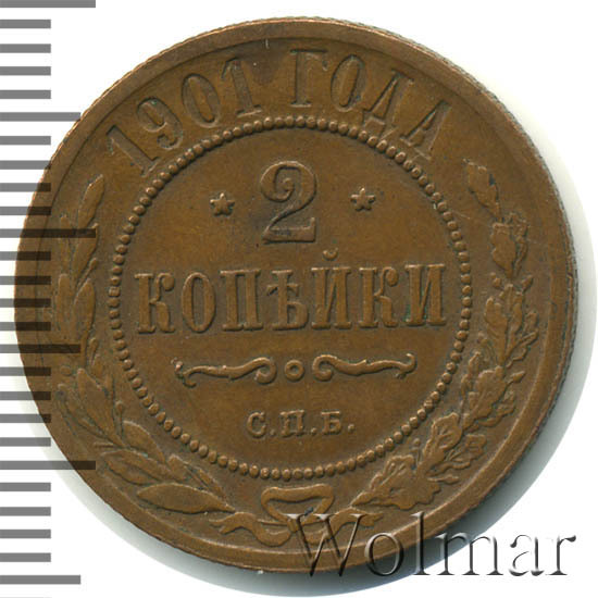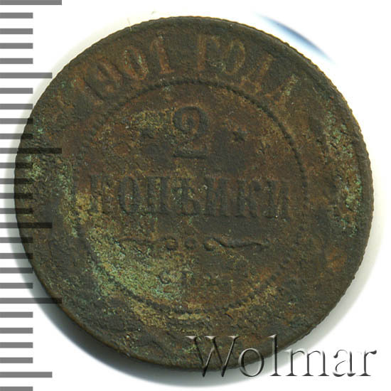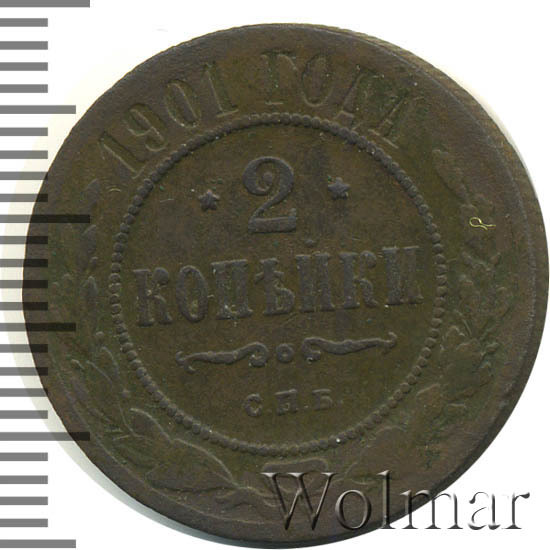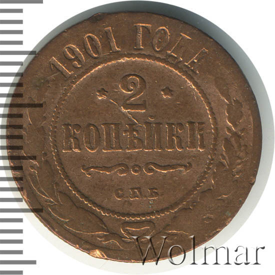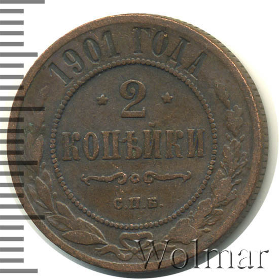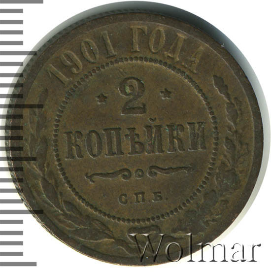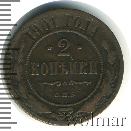 Монета 2 копейки 1901 года - обыкновенная широкораспространенная монета времен царствования Николая II. Чеканилась монета на заводе Розенкранца в г. Санкт-Петербург огромным тиражом, так же как и монеты: 2 копейки 1900 года СПБ, 2 копейки 1899 года СПБ. Она есть во многих коллекциях нумизматов-любителей, поэтому и не имеет большой цены. Более дорогими являются монеты в превосходной сохранности, где нет следов обращения. Кроме того, среди монет 2 копейки 1901 года существуют экземпляры, отчеканенные полированными штемпелями качества Пруф - их стоимость во много раз превышает стоимость монет регулярного чекана.