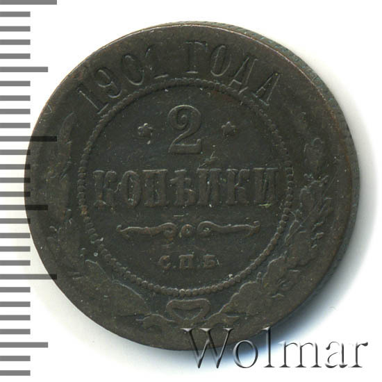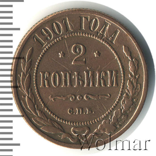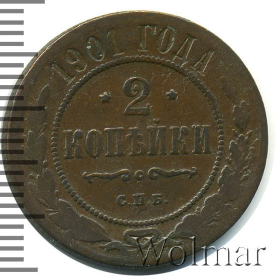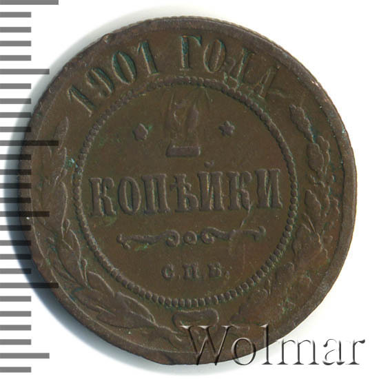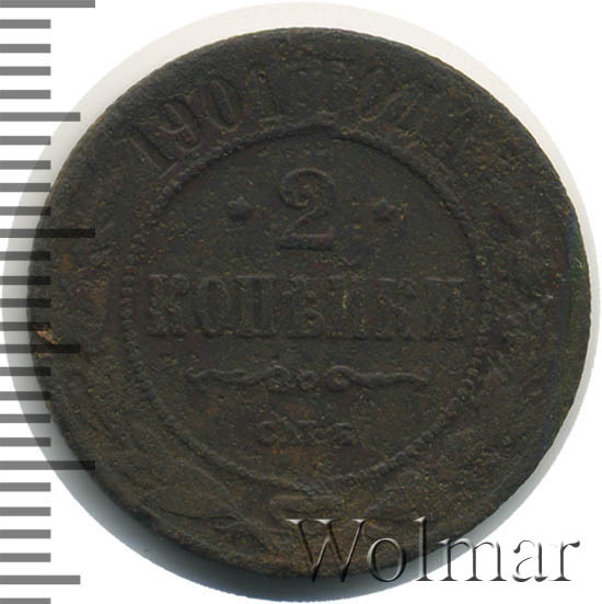 В центре указан номинал — цифра «2», ограниченная с обеих сторон звездочками. Под цифрой номинала — слово "КОПЕЙКИ". Ниже, расположен декоративный разделитель в виде двух изогнутых линий и небольшой окружности между ними. Под разделителем — обозначение монетного двора «С.П.Б.». Центральная часть отделена от остального изображения, окружностью в виде точек. В верхней части полукругом углубленная надпись: "1901 ГОДА". Ниже этой надписи, вдоль канта, изображен венок из лавровой и дубовой ветвей, которые, в нижней части, перевязаны лентой на узел бантом.