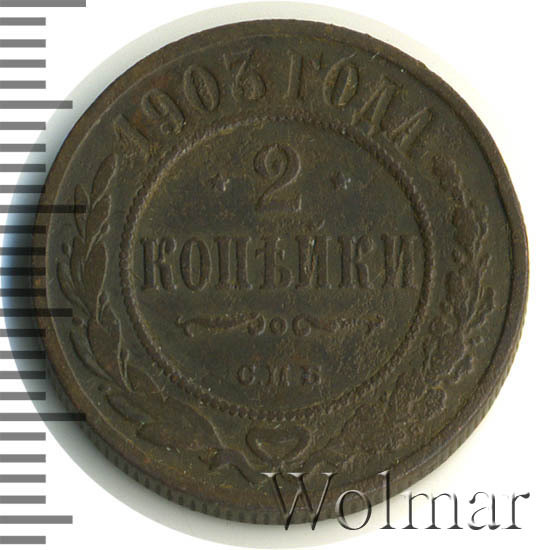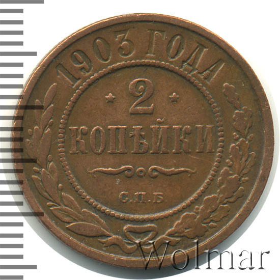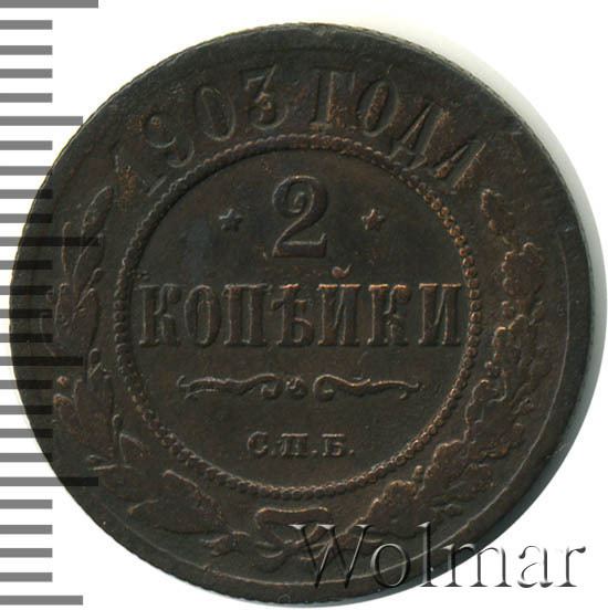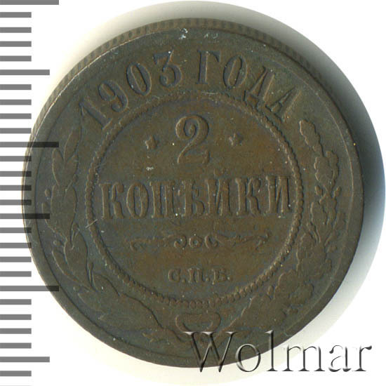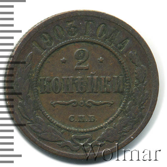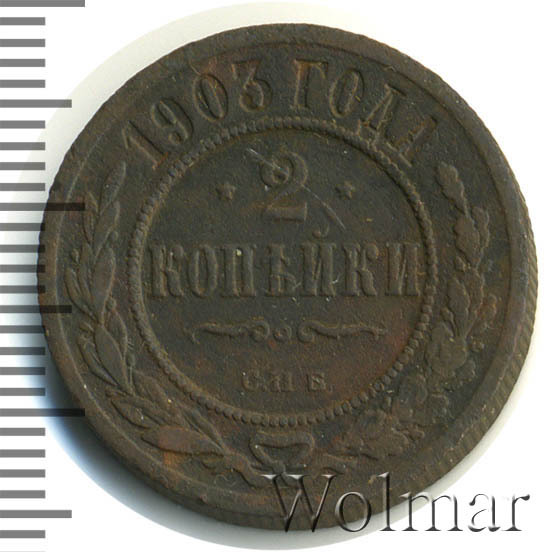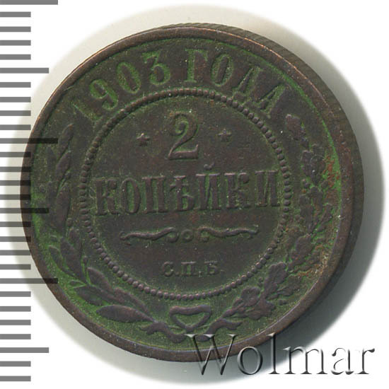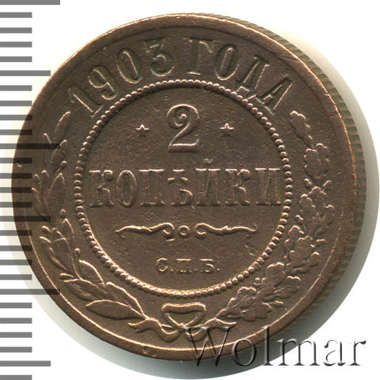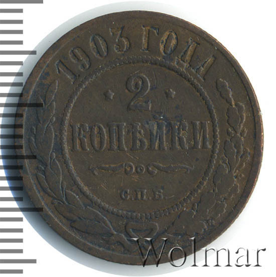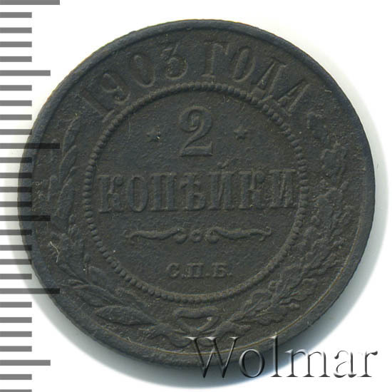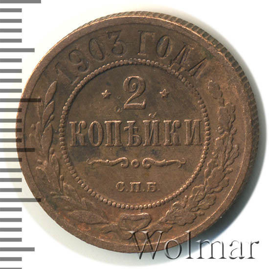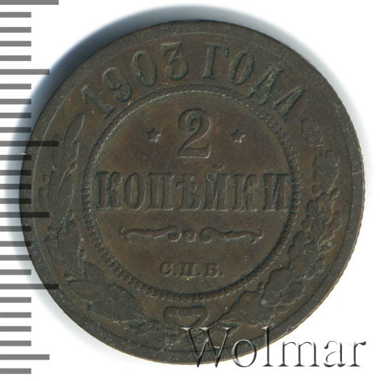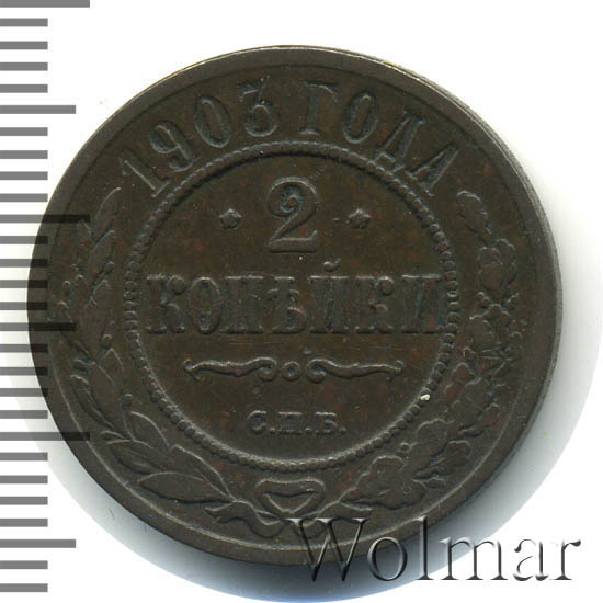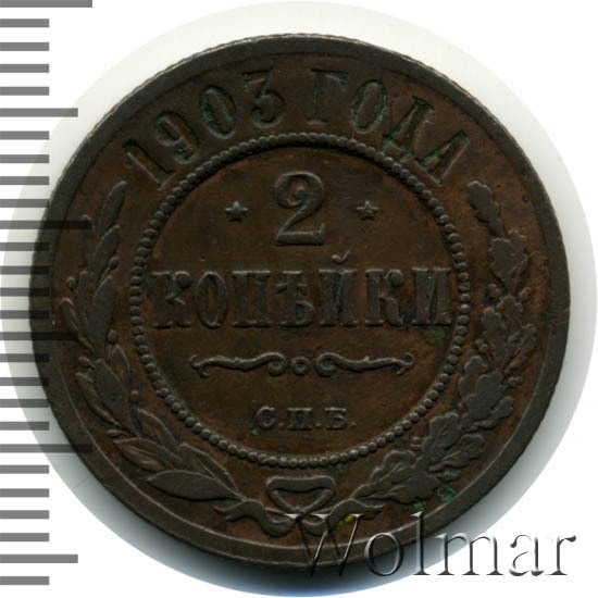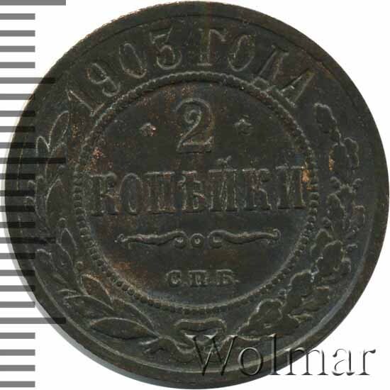 Монета 2 копейки 1903 года СПБ чеканилась на Санкт-Петербургском монетном дворе. Это рядовая монета времен правления Николая II, выпущенная огромным тиражом (почти 30 млн штук), встречается в любительских коллекциях повсеместно, а следовательно большой ценности не несет, за исключением хорошо сохранившихся экземпляров в сохранности UNC, то есть не побывавших в обращении. Заслуживает внимания монета 2 копейки 1903 года качества выпуска Proof, которую найти не просто и цена этой монеты во много раз превышает стоимость монет регулярного чекана того же года и номинала.