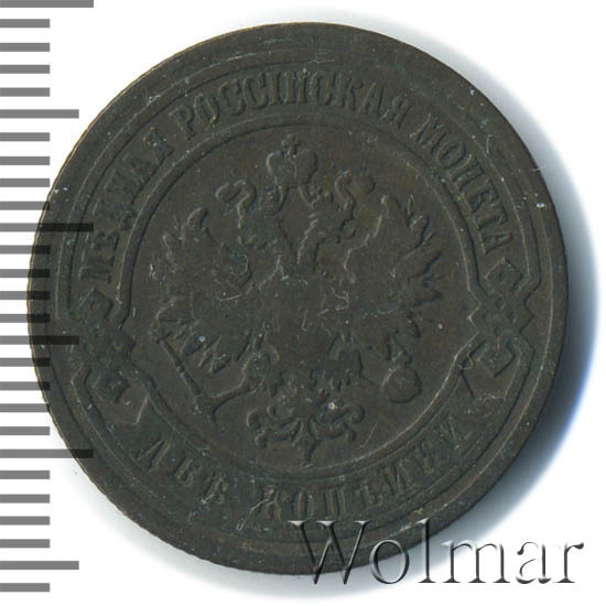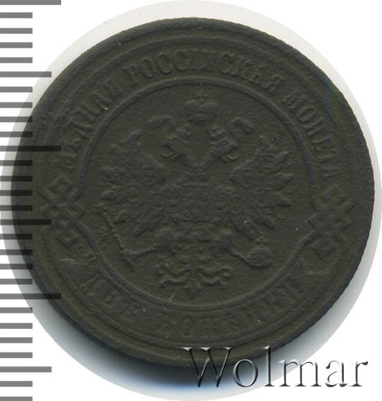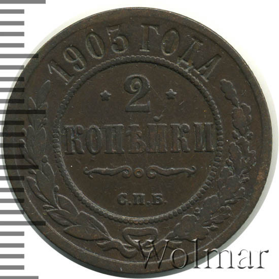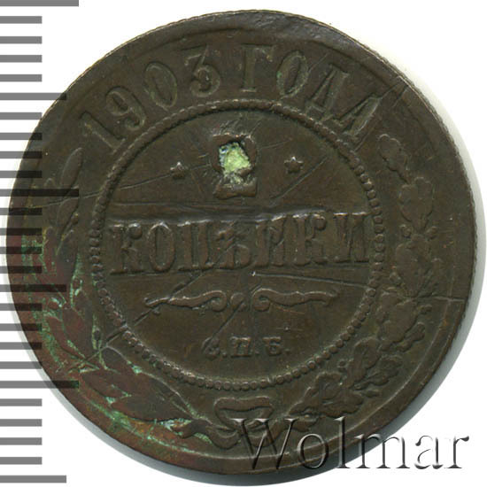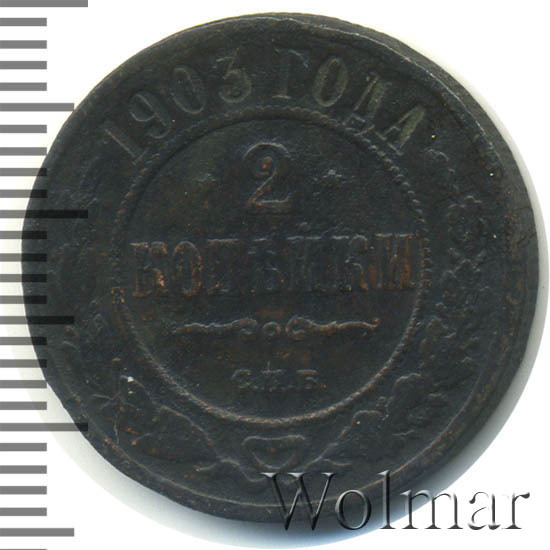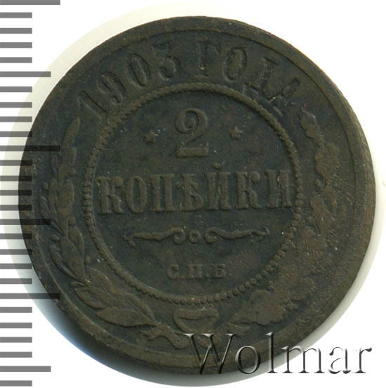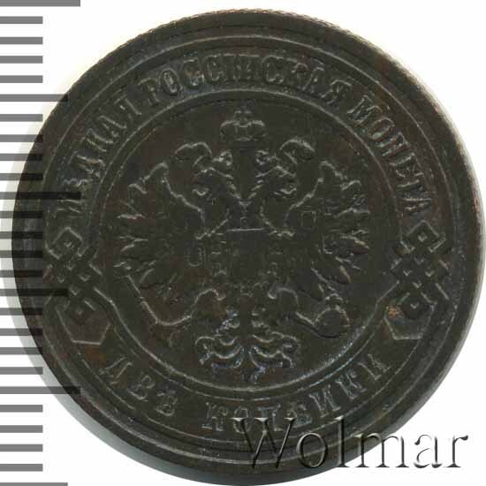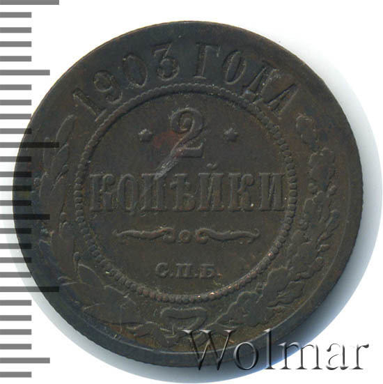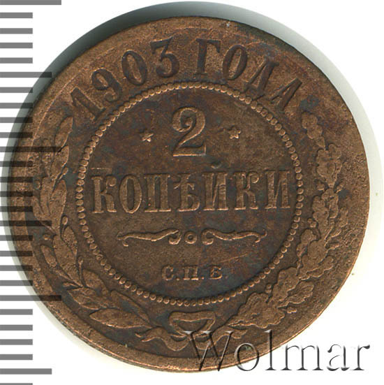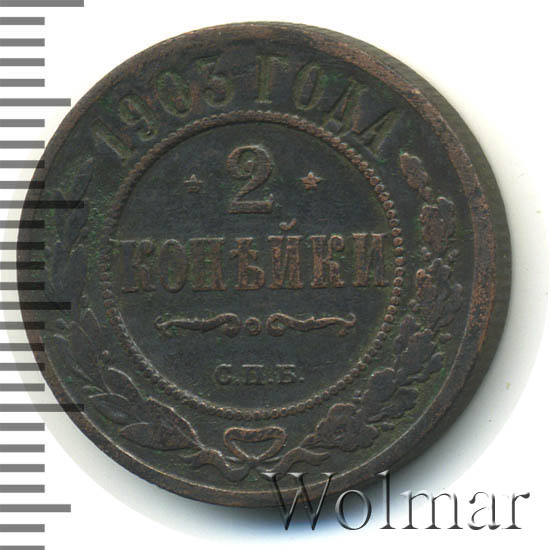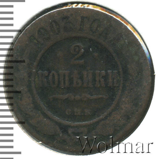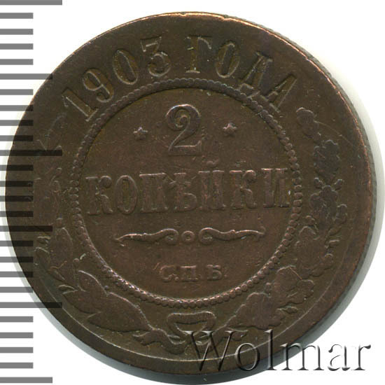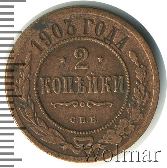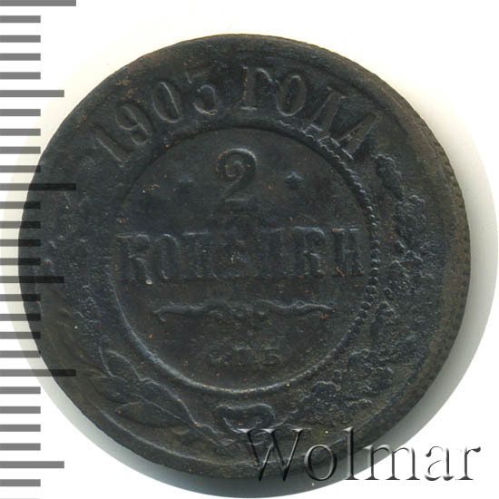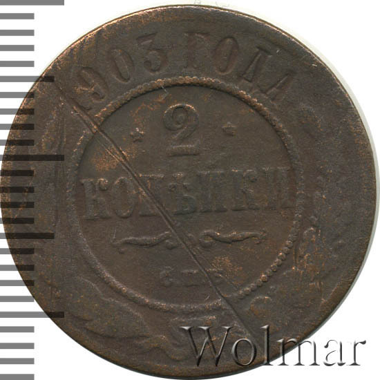 Монета 2 копейки 1903 года СПБ чеканилась на Санкт-Петербургском монетном дворе. Это рядовая монета времен правления Николая II, выпущенная огромным тиражом (почти 30 млн штук), встречается в любительских коллекциях повсеместно, а следовательно большой ценности не несет, за исключением хорошо сохранившихся экземпляров в сохранности UNC, то есть не побывавших в обращении. Заслуживает внимания монета 2 копейки 1903 года качества выпуска Proof, которую найти не просто и цена этой монеты во много раз превышает стоимость монет регулярного чекана того же года и номинала.