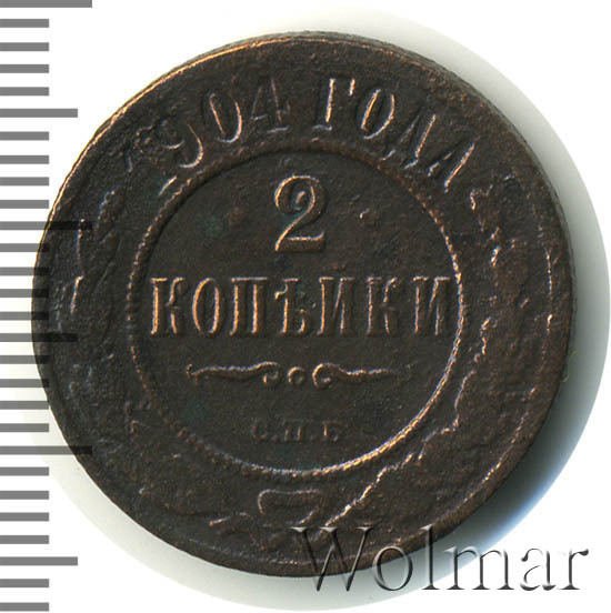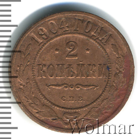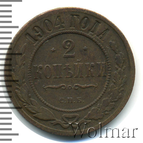 В центре указан номинал — цифра «2», ограниченная с обеих сторон звездочками. Под цифрой номинала — слово "КОПЕЙКИ". Ниже, расположен декоративный разделитель в виде двух изогнутых линий и небольшой окружности между ними. Под разделителем — обозначение монетного двора «С.П.Б.». Центральная часть отделена от остального изображения, окружностью в виде точек. В верхней части полукругом углубленная надпись: "1904 ГОДА". Ниже этой надписи, вдоль канта, изображен венок из лавровой и дубовой ветвей, которые, в нижней части, перевязаны лентой на узел бантом.