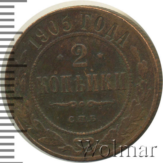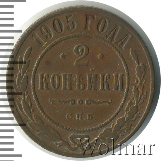 В центре указан номинал — цифра «2», ограниченная с обеих сторон звездочками. Под цифрой номинала — слово "КОПЕЙКИ". Ниже, расположен декоративный разделитель в виде двух изогнутых линий и небольшой окружности между ними. Под разделителем — обозначение монетного двора «С.П.Б.». Центральная часть отделена от остального изображения, окружностью в виде точек. В верхней части полукругом углубленная надпись: "1905 ГОДА". Ниже этой надписи, вдоль канта, изображен венок из лавровой и дубовой ветвей, которые, в нижней части, перевязаны лентой на узел бантом.