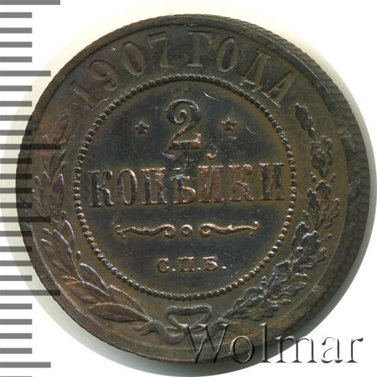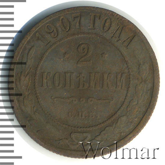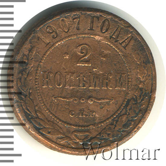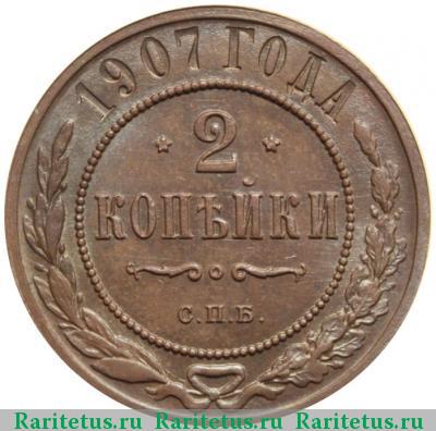 В центре указан номинал — цифра «2», ограниченная с обеих сторон звездочками. Под цифрой номинала — слово "КОПЕЙКИ". Ниже, расположен декоративный разделитель в виде двух изогнутых линий и небольшой окружности между ними. Под разделителем — обозначение монетного двора «С.П.Б.». Центральная часть отделена от остального изображения, окружностью в виде точек. В верхней части полукругом углубленная надпись: "1907 ГОДА". Ниже этой надписи, вдоль канта, изображен венок из лавровой и дубовой ветвей, которые, в нижней части, перевязаны лентой на узел бантом.