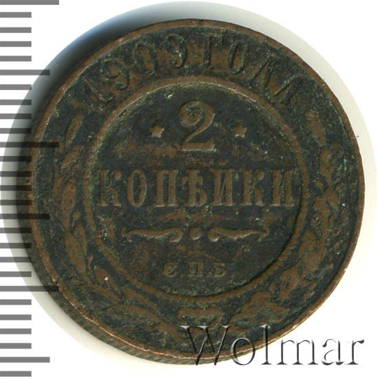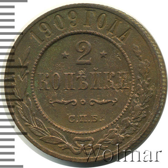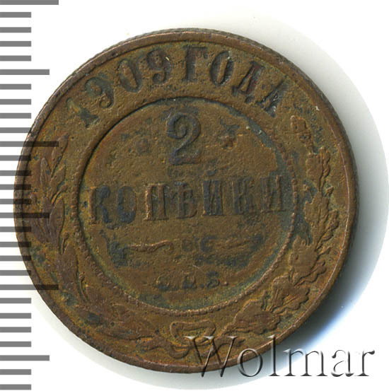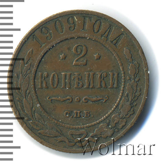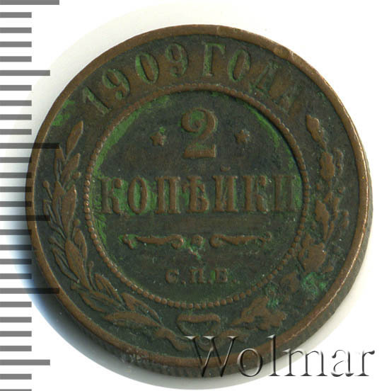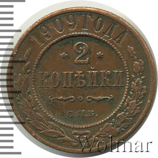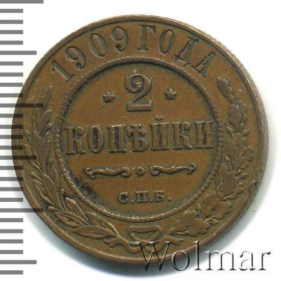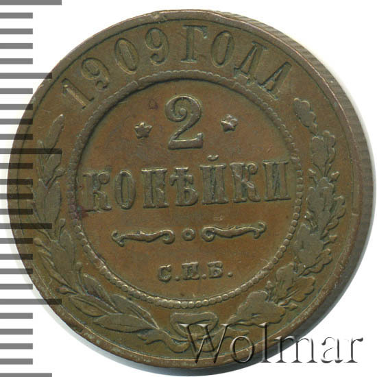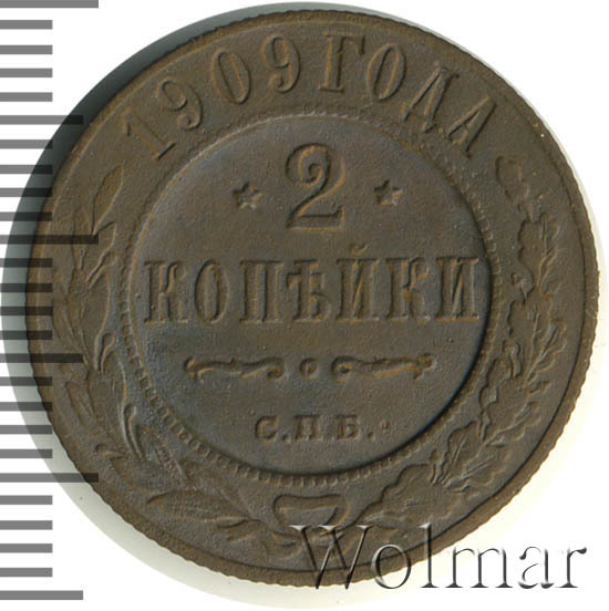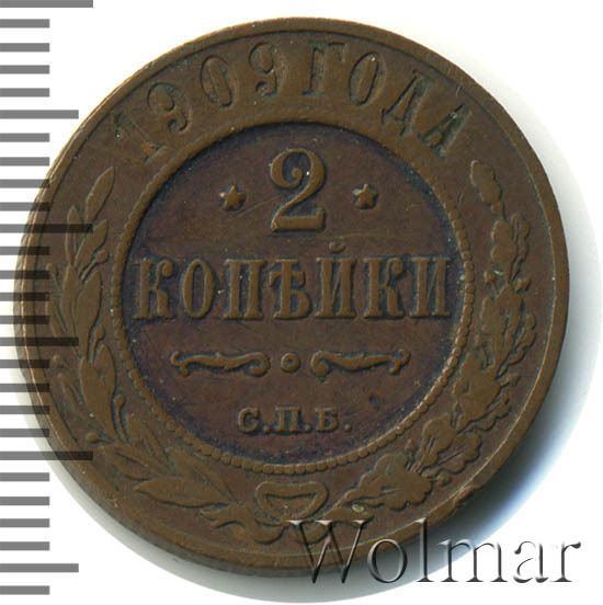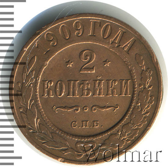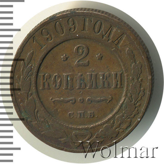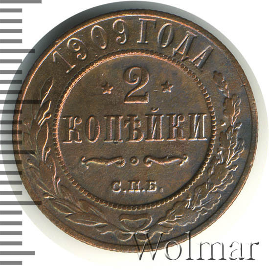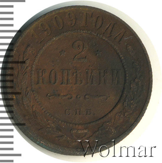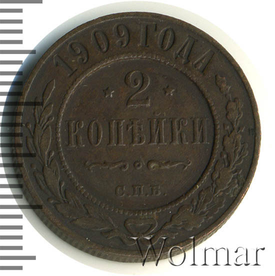 В центре указан номинал — цифра «2», ограниченная с обеих сторон звездочками. Под цифрой номинала — слово "КОПЕЙКИ". Ниже, расположен декоративный разделитель в виде двух изогнутых линий и небольшой окружности между ними. Под разделителем — обозначение монетного двора «С.П.Б.». Центральная часть отделена от остального изображения, окружностью в виде точек. В верхней части полукругом углубленная надпись: "1909 ГОДА". Ниже этой надписи, вдоль канта, изображен венок из лавровой и дубовой ветвей, которые, в нижней части, перевязаны лентой на узел бантом.