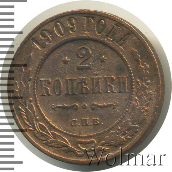 Монета 2 копейки 1909 года отчеканена на медной заготовке во время царствования последнего Императора Николая II. Санкт-Петербургский монетный двор выпустил довольно большую партию этих монет в обращение, вследствие чего эта монета широко распространена среди коллекционеров и не имеет большой коллекционной ценности, по сравнению с некоторыми другими монетами этой эпохи. Тем не менее, 2 копейки 1909 года СПБ в сохранности АЦ - отсноительно ценный экземпляр, стоимость которого значительно выше аналогичных монет, побывавших в обращении.