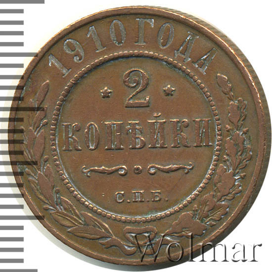 В центре указан номинал — цифра «2», ограниченная с обеих сторон звездочками. Под цифрой номинала — слово "КОПЕЙКИ". Ниже, расположен декоративный разделитель в виде двух изогнутых линий и небольшой окружности между ними. Под разделителем — обозначение монетного двора «С.П.Б.». Центральная часть отделена от остального изображения, окружностью в виде точек. В верхней части полукругом углубленная надпись: "1910 ГОДА". Ниже этой надписи, вдоль канта, изображен венок из лавровой и дубовой ветвей, которые, в нижней части, перевязаны лентой на узел бантом.
