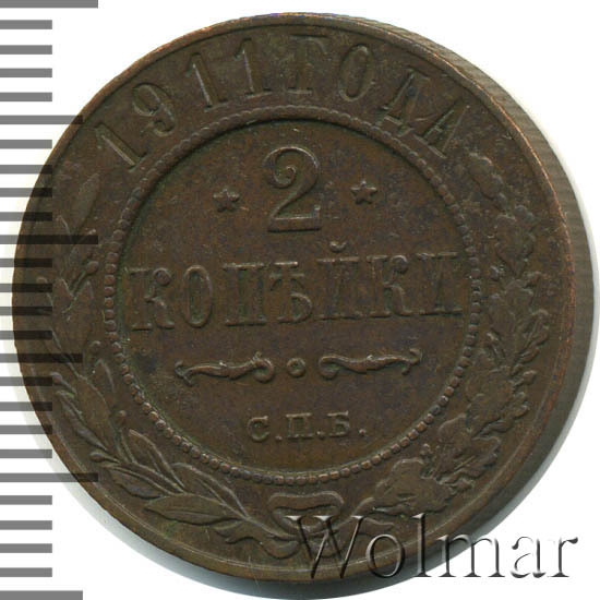 В центре указан номинал — цифра «2», ограниченная с обеих сторон звездочками. Под цифрой номинала — слово "КОПЕЙКИ". Ниже, расположен декоративный разделитель в виде двух изогнутых линий и небольшой окружности между ними. Под разделителем — обозначение монетного двора «С.П.Б.». Центральная часть отделена от остального изображения, окружностью в виде точек. В верхней части полукругом углубленная надпись: "1911 ГОДА". Ниже этой надписи, вдоль канта, изображен венок из лавровой и дубовой ветвей, которые, в нижней части, перевязаны лентой на узел бантом.