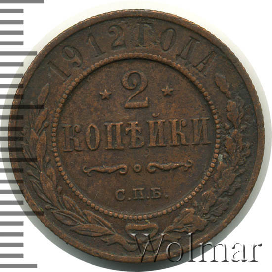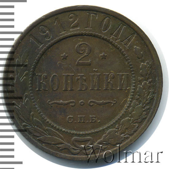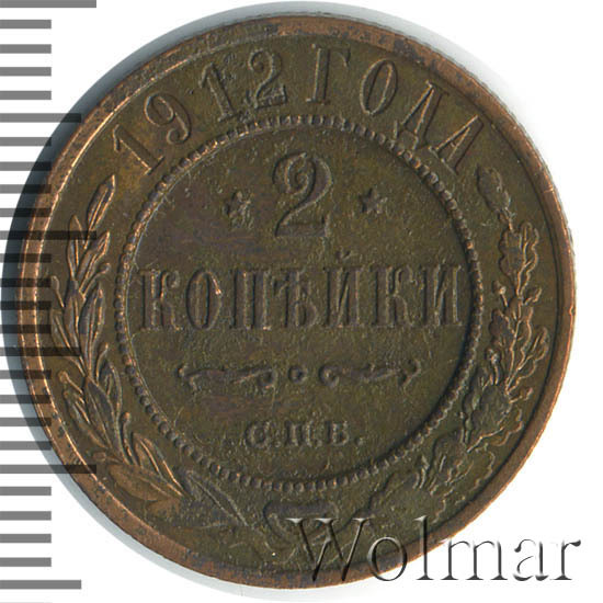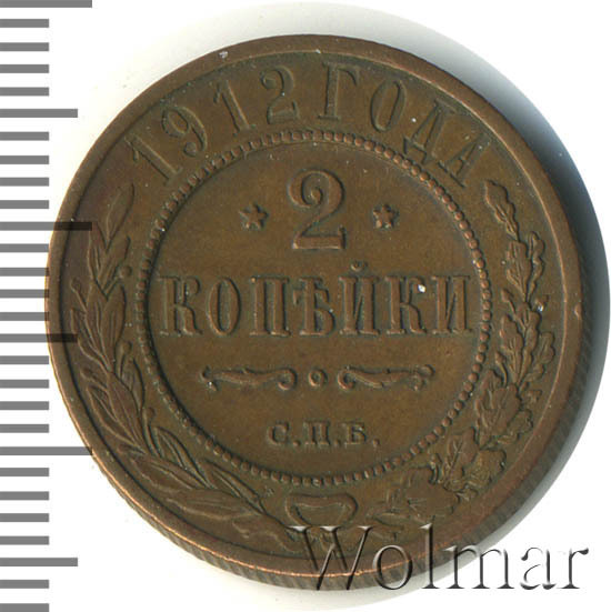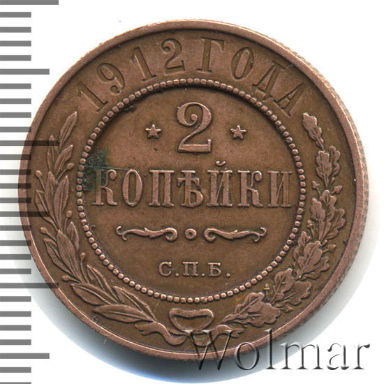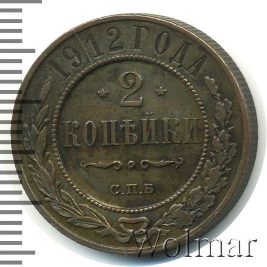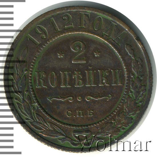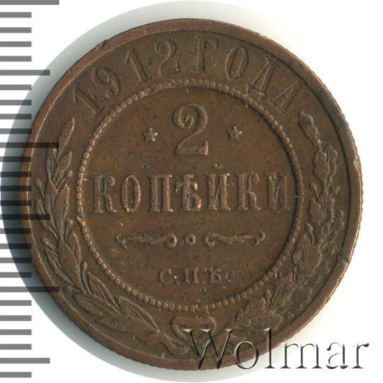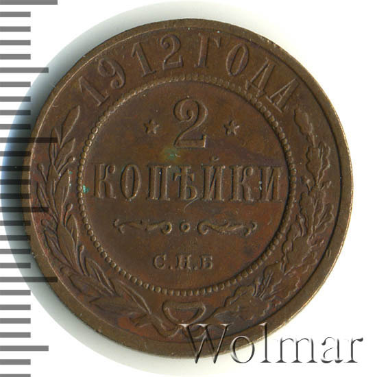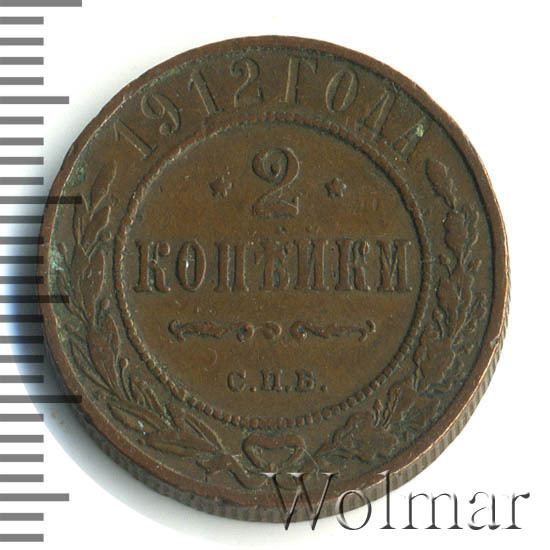 В центре указан номинал — цифра «2», ограниченная с обеих сторон звездочками. Под цифрой номинала — слово "КОПЕЙКИ". Ниже, расположен декоративный разделитель в виде двух изогнутых линий и небольшой окружности между ними. Под разделителем — обозначение монетного двора «С.П.Б.». Центральная часть отделена от остального изображения, окружностью в виде точек. В верхней части полукругом углубленная надпись: "1912 ГОДА". Ниже этой надписи, вдоль канта, изображен венок из лавровой и дубовой ветвей, которые, в нижней части, перевязаны лентой на узел бантом.