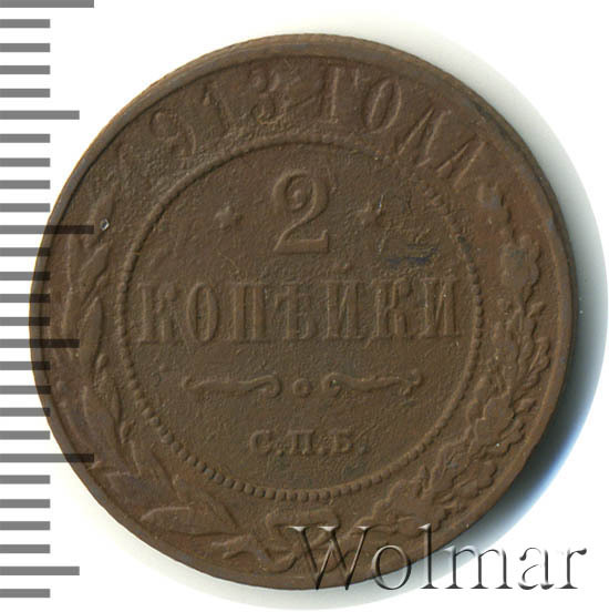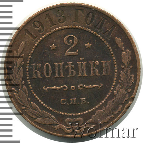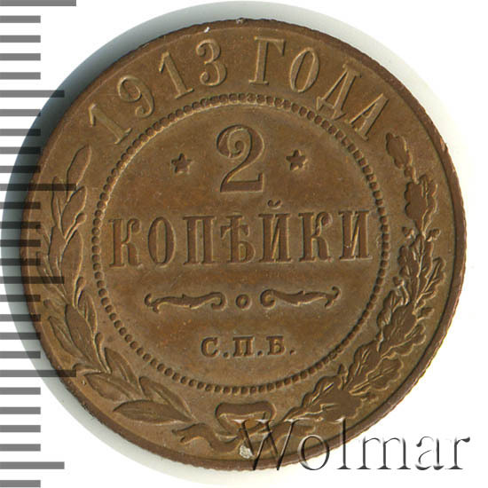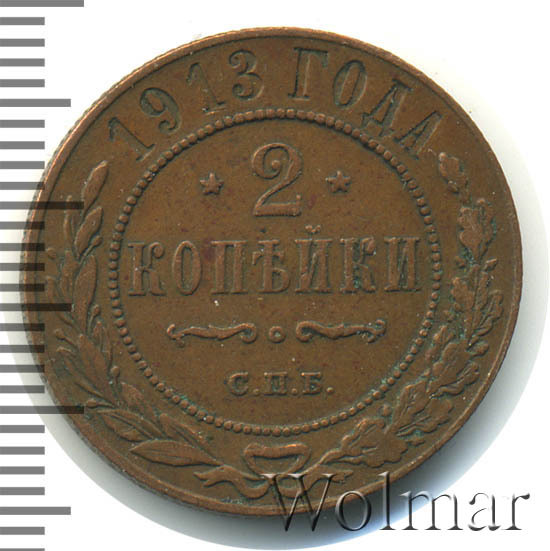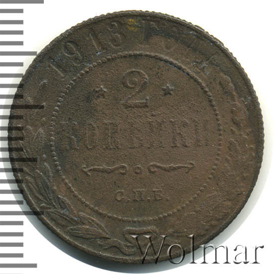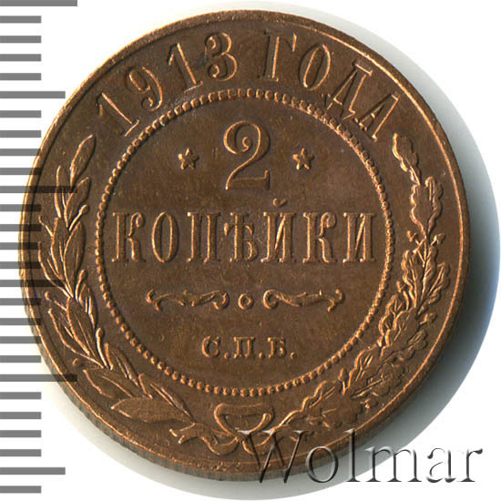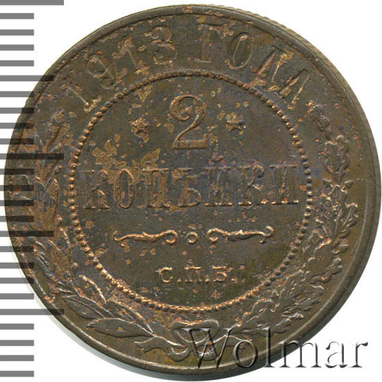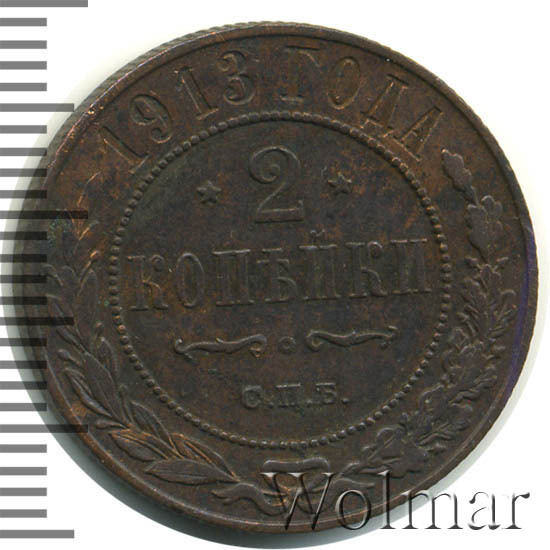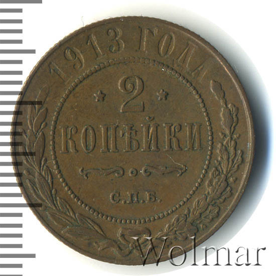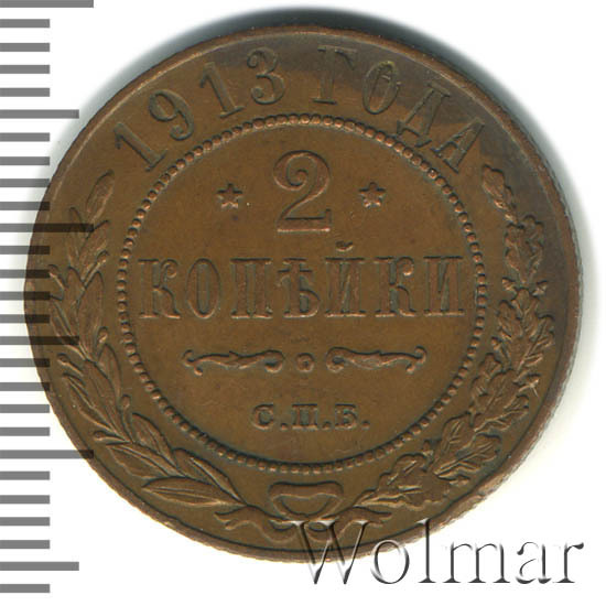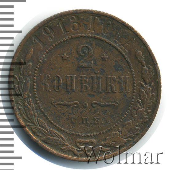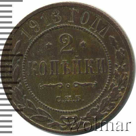 В центре указан номинал — цифра «2», ограниченная с обеих сторон звездочками. Под цифрой номинала — слово "КОПЕЙКИ". Ниже, расположен декоративный разделитель в виде двух изогнутых линий и небольшой окружности между ними. Под разделителем — обозначение монетного двора «С.П.Б.». Центральная часть отделена от остального изображения, окружностью в виде точек. В верхней части полукругом углубленная надпись: "1913 ГОДА". Ниже этой надписи, вдоль канта, изображен венок из лавровой и дубовой ветвей, которые, в нижней части, перевязаны лентой на узел бантом.
