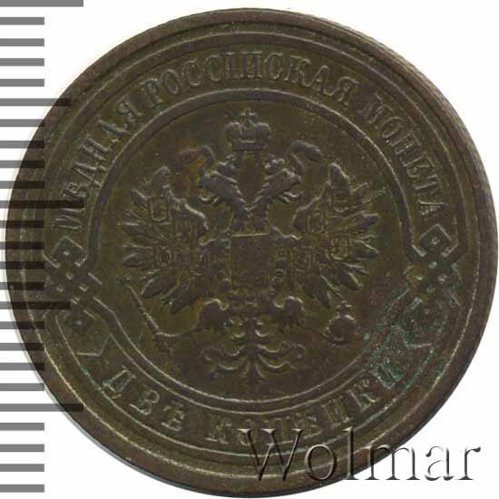 В центре монеты изображен Малый Государственный Герб Российской империи - двуглавый орел, головы которого увенчаны двумя коронами, третья, большая корона над ними. Все они соединены лентой Андрея Первозванного. В правой лапе орла – скипетр, в левой – держава. На его груди расположен Московский герб, в щите изображен Георгий Победоносец с копьем поражающий дракона. Вокруг щита цепь ордена Св. Апостола Андрея Первозванного. На крыльях орла изображены гербы: Царства Казанского, Польского, Херсонеса Таврического, Астраханского, Сибирского, Грузинского и герб соединенных княжеств Киевского, Новгородского и Владимирского — по 4 на каждое крыло. По окружности - две полукруглые плашки, соединенные узорами. На верхней плашке выпуклая надпись: "МЕДНАЯ РОССИЙСКАЯ МОНЕТА". На нижней плашке, изображенной в виде ленты, углубленная надпись: "ДВЕ КОПЕЙКИ".