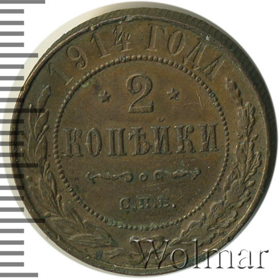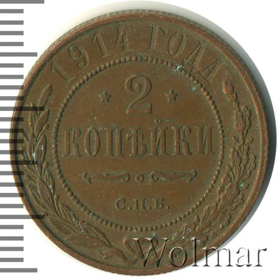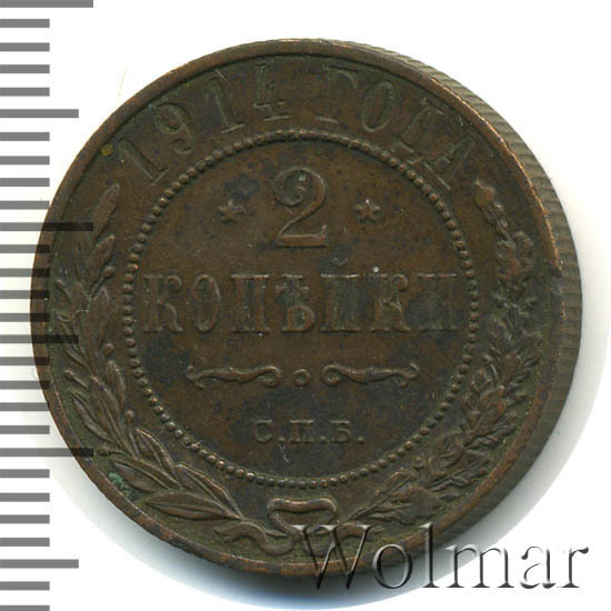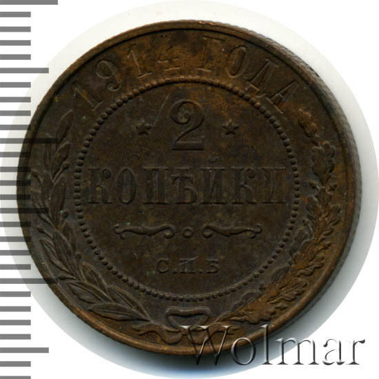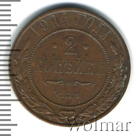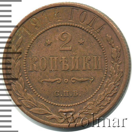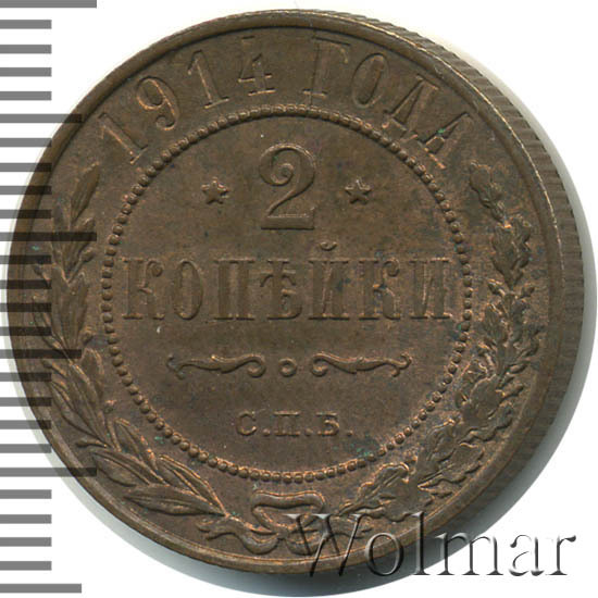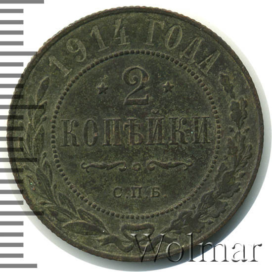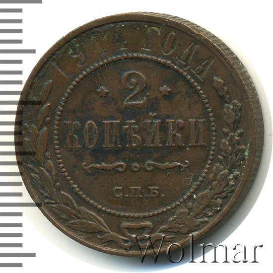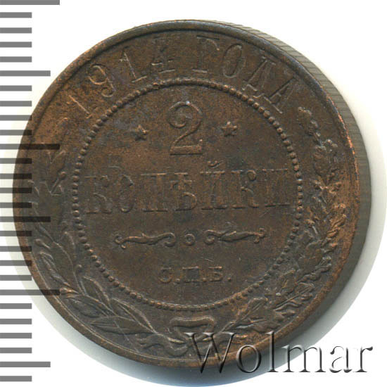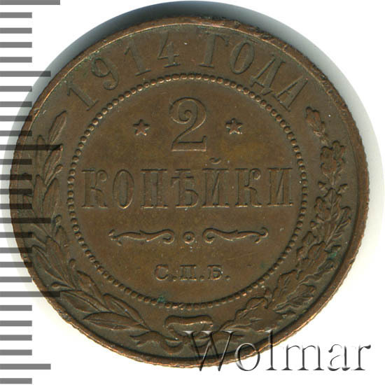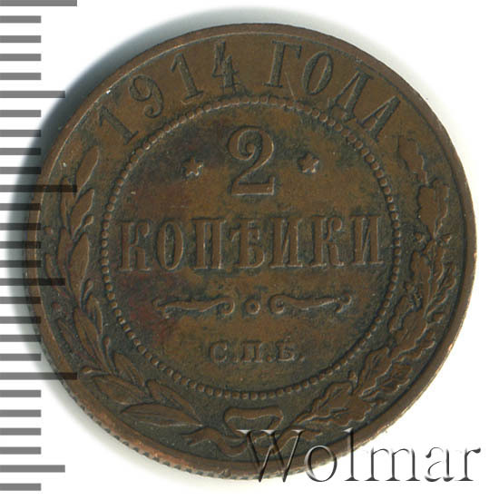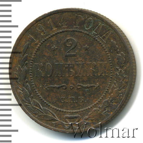 В центре указан номинал — цифра «2», ограниченная с обеих сторон звездочками. Под цифрой номинала — слово "КОПЕЙКИ". Ниже, расположен декоративный разделитель в виде двух изогнутых линий и небольшой окружности между ними. Под разделителем — обозначение монетного двора «С.П.Б.». Центральная часть отделена от остального изображения, окружностью в виде точек. В верхней части полукругом углубленная надпись: "1914 ГОДА". Ниже этой надписи, вдоль канта, изображен венок из лавровой и дубовой ветвей, которые, в нижней части, перевязаны лентой на узел бантом.