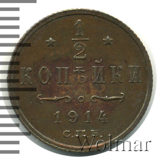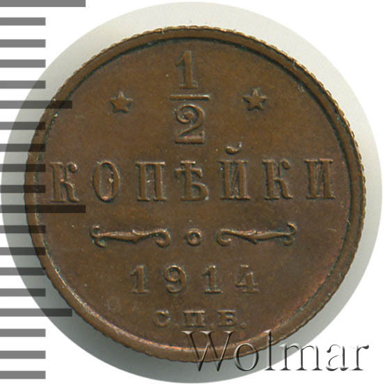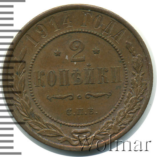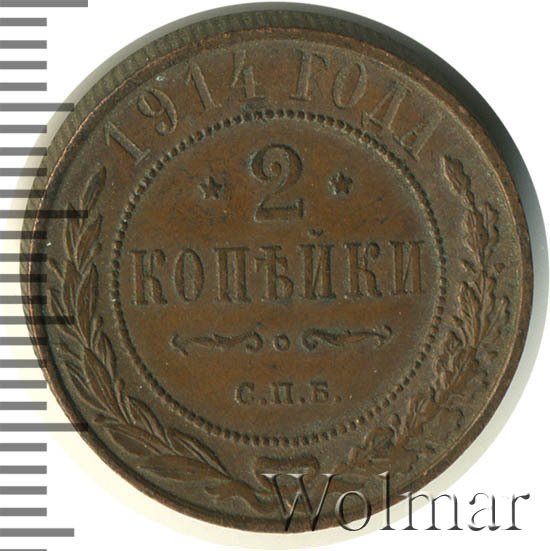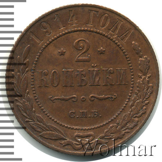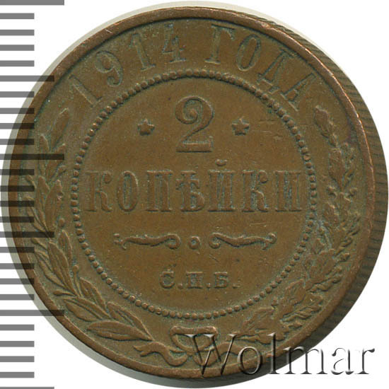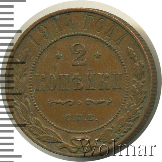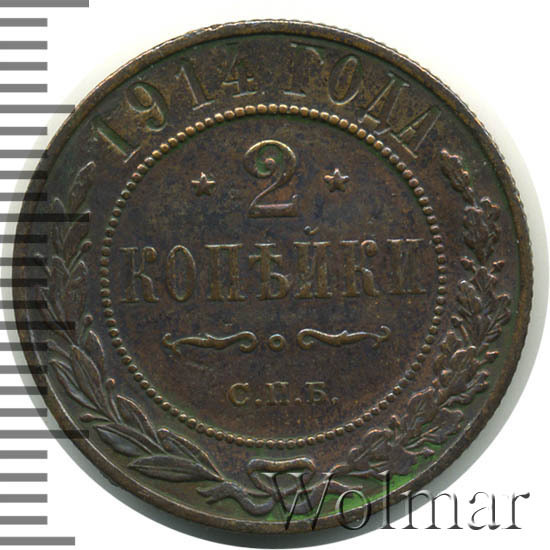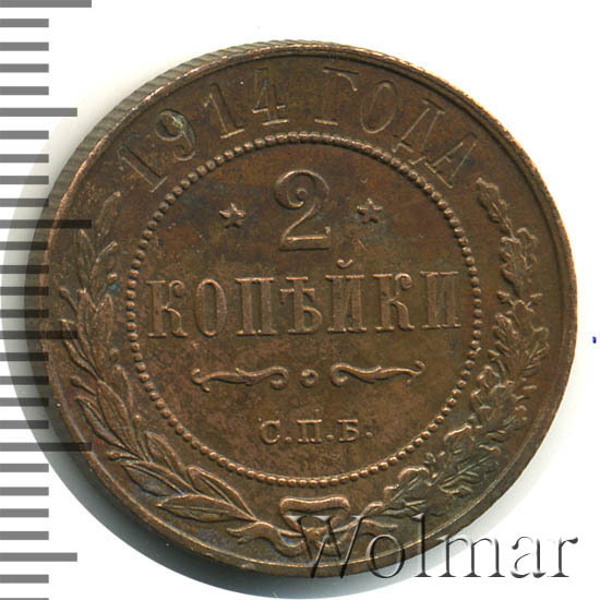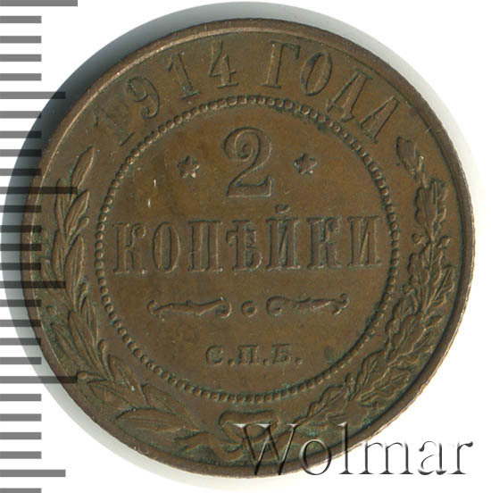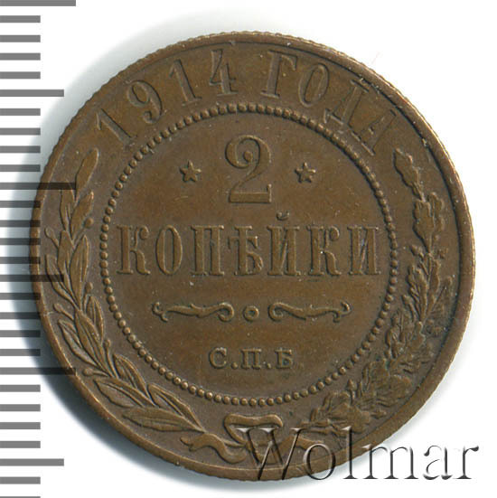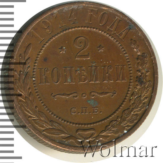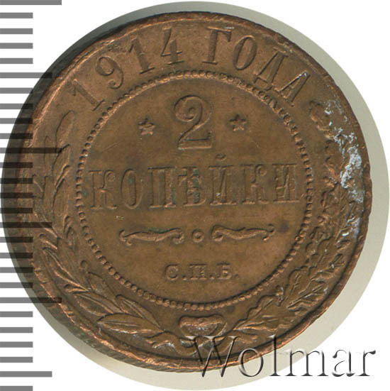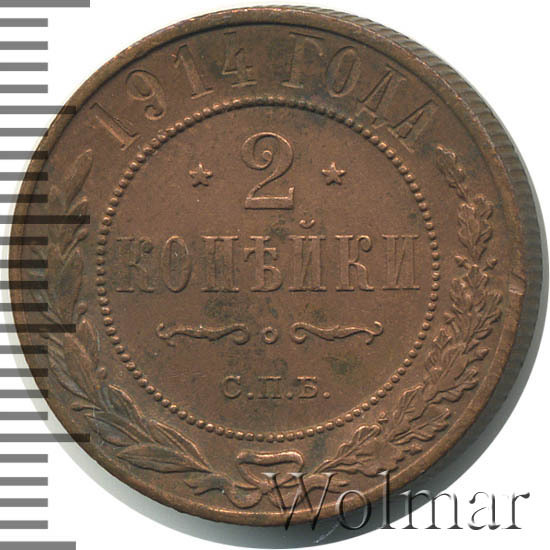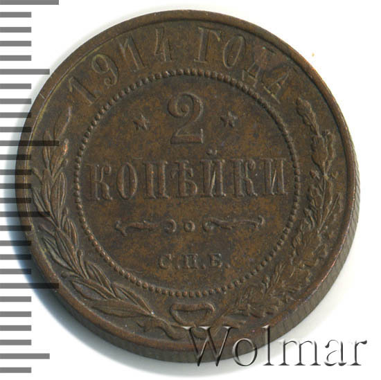 Медная монета 2 копейки 1914г СПБ была произведена на Санкт-Петербургском монетном дворе при Императоре Николае II. На монете отчеканена роковая дата - год начала 1-ой Мировой Войны. Несмотря на это, тираж монеты довольно велик и встречается она часто, а значит не имеет большой ценности среди коллекицонеров. Однако, монеты, дошедшие до наших дней в неизменном виде, имеющие сохранность АЦ, представляют большой интерес для нумизматови могут стоить довольно дорого. Отдельно стоит выделить монеты 2 копейки 1914 года СПБ, отчеканенные полироанными штемпелями, так называемые пруф-монеты. Цена таких экземпляров во много раз превышиет стоимость аналогичных монет того же номинала и года, но предназначенных для обращения.
