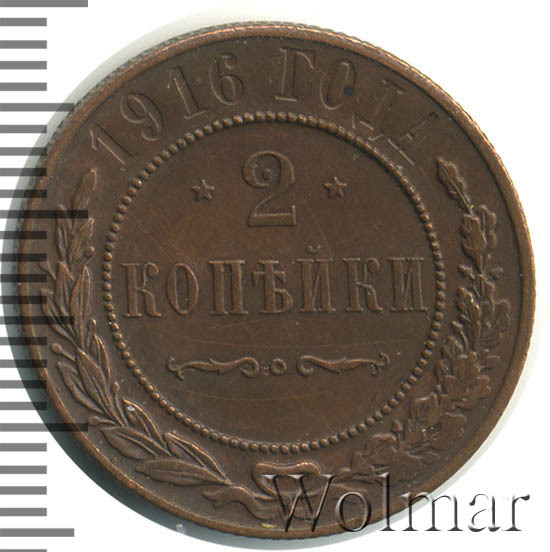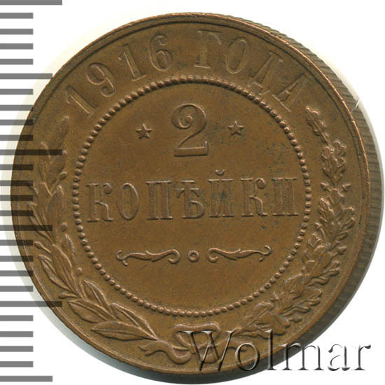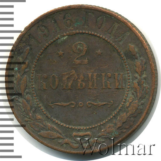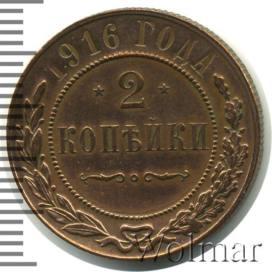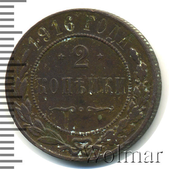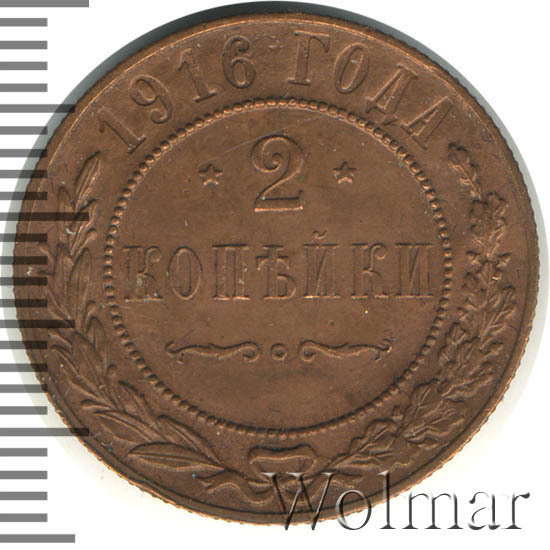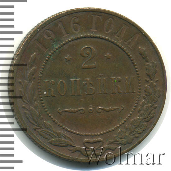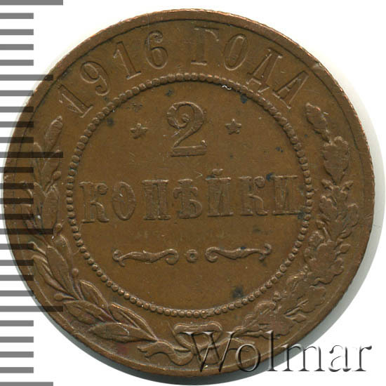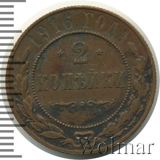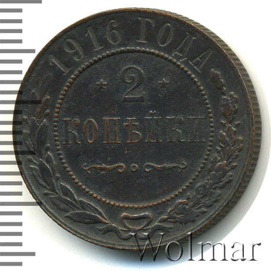Медная монета 2 копейки 1916 года одна из последних монет Российской Имерии и подобно монете 2 копейки 1915 года не имеет буквенных обозначений на реверсе, что делает ее по-своему уникальной (такое отличие связано с переименованием Санкт-Петербурга в Петроград). Однако, тираж этой монеты очень большой и встречается она весьма часто и повсеместно, а значит и цена ее небольшая. Наиболее дорогие экземпляры, представляющие интерес для коллекционеров, имеют состояние uncirculated. Это значит, что монета не была в обороте и цена на такие монеты значительно выше, чем на те, которые циркулировали среди населения. Кроме того, стоит отметь о существование 2 копеек 1916 года качества Proof, стоимость которых во много раз превышает цену монет для обращения, даже сохранности UNC.