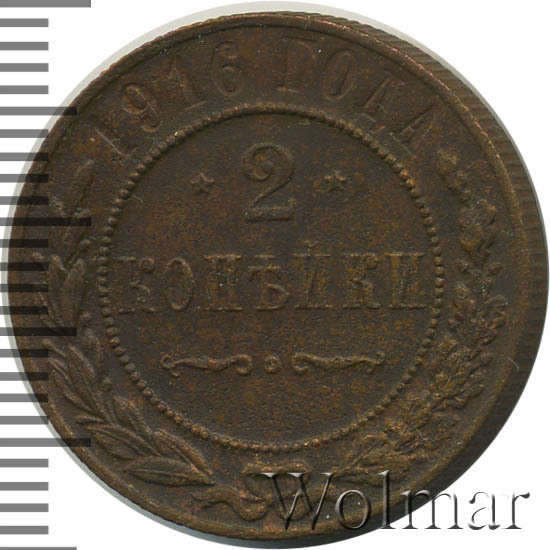 В центре указан номинал — цифра «2», ограниченная с обеих сторон звездочками. Под цифрой номинала — слово "КОПЕЙКИ". Ниже, расположен декоративный разделитель в виде двух изогнутых линий и небольшой окружности между ними. Центральная часть отделена от остального изображения, окружностью в виде точек. В верхней части полукругом углубленная надпись: "1916 ГОДА". Вдоль канта изображен венок из лавровой и дубовой ветвей, которые, в нижней части, перевязаны лентой на узел бантом.