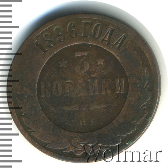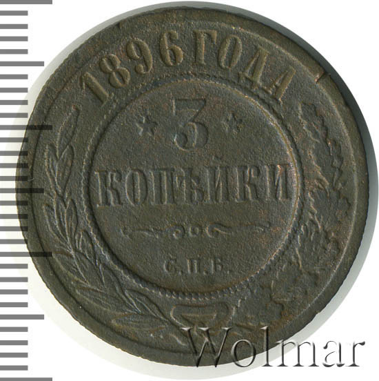 Медная монета 3 копейки 1896 года СПБ чеканилась не в Санкт-Петербурге (как можно подумать, глядя на буквы "СПБ"), а в Великобритании на Бирменгемском монетном дворе по заказу Императорского двора Николая II. Тираж монеты довольно большой, что отражается на цене. Стоимость данной монеты не велика. Однако, экземпляры в сохранности AU, а особенно UNC ценятся довольно высоко. Особый интерес представляют монеты качества чеканки Proof - их найти нелегко и стоят соответственно такие монеты во много раз дороже тех же, но обычного качества чеканки.