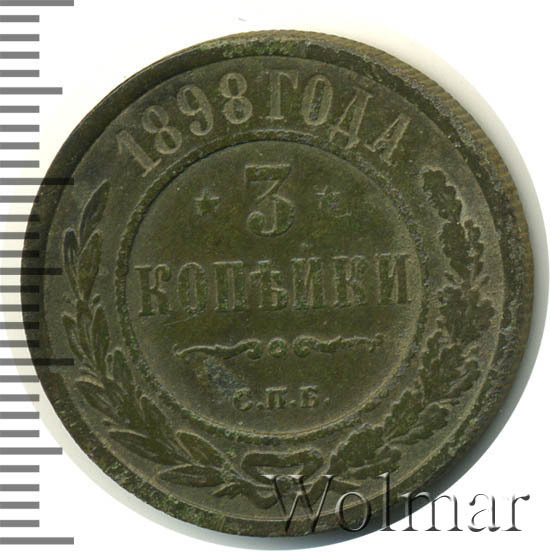 В центре указан номинал — цифра «3», ограниченная с обеих сторон звездочками. Под цифрой номинала — слово "КОПЕЙКИ". Ниже, расположен декоративный разделитель в виде двух изогнутых линий и небольшой окружности между ними. Под разделителем — обозначение монетного двора «С.П.Б.». Центральная часть отделена от остального изображения, окружностью в виде точек. В верхней части полукругом углубленная надпись: "1898 ГОДА". Ниже этой надписи, вдоль канта, изображен венок из лавровой и дубовой ветвей, которые, в нижней части, перевязаны лентой на узел бантом.