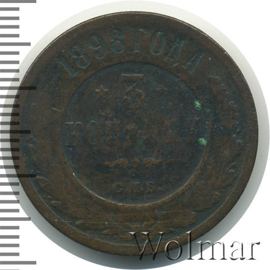 Медные монеты 1898 года - это последнее поколение разменных монет, которые чеканились на Бирмингемском монетном дворе в Великобритании. Начиная со следующего года, чеканка вновь вернулась в Санкт-Петербург. Найти данную монету не составит большого труда. Довольно редкими можно считать экземпляры в сохранности UNC, а действительно редкими - 3 копейки 1898 года качества чеканки Proof, которые были выпущены ограниченным тиражом. Цена на такие монеты ощутимо превосходит стоимость тех же но в более низкой сохранности как например XF или VF.