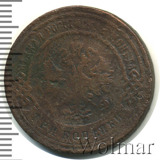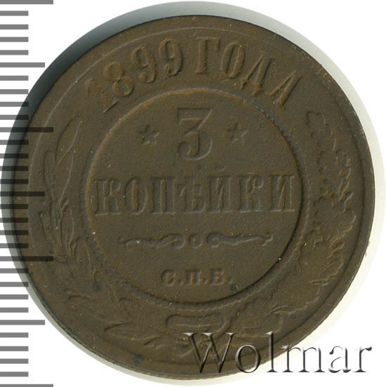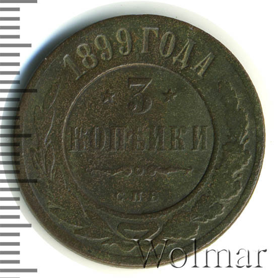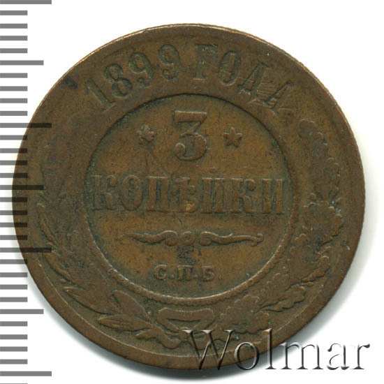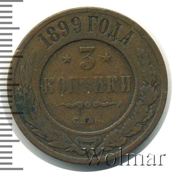 Начиная с 1899 года чеканка медных монет вернулась в Санкт-Петербург. 3 копейки 1899 года СПБ чеканились на заводе Розенкранца при Императоре Николае II. Всего в оборот было выпущено более 10 млн монет. Таким образом, до наших дней дошло большое количество монет этого номинала и года. Но, важно понимать, что большинство столь старых монет сохранились довольно плохо, особенно если они долгое время находились в обороте. Такие монеты не представляют большой ценности и стоят они совсем недорого. А вот те монеты, которые остались в первозданном виде и даже сохранили штемпельный блеск ценятся больше всего (состояние UNC). Отдельно стоит сказать о монетах качества чеканки Proof - цена таких монет во много раз превосходит стоимость аналогичных, но регулярного чекана.