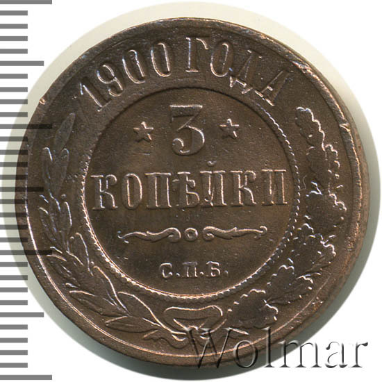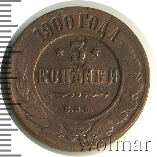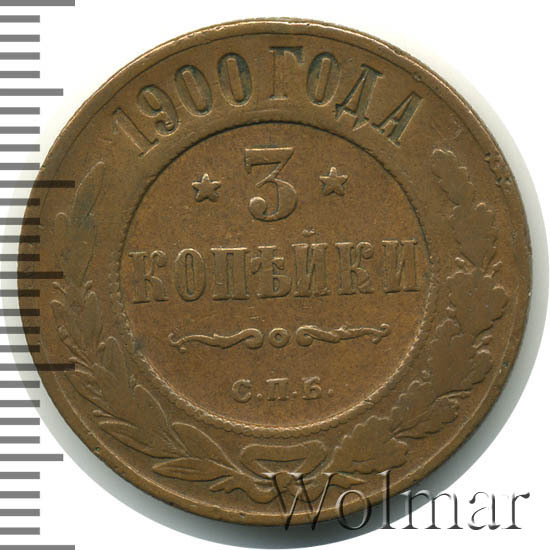 В центре указан номинал — цифра «3», ограниченная с обеих сторон звездочками. Под цифрой номинала — слово "КОПЕЙКИ". Ниже, расположен декоративный разделитель в виде двух изогнутых линий и небольшой окружности между ними. Под разделителем — обозначение монетного двора «С.П.Б.». Центральная часть отделена от остального изображения, окружностью в виде точек. В верхней части полукругом углубленная надпись: "1900 ГОДА". Ниже этой надписи, вдоль канта, изображен венок из лавровой и дубовой ветвей, которые, в нижней части, перевязаны лентой на узел бантом.
