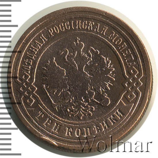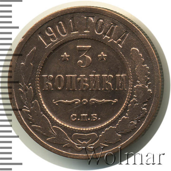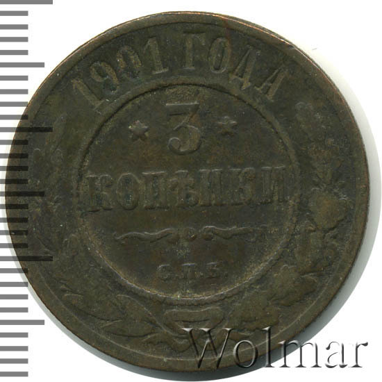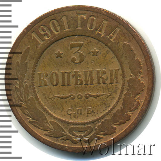 Медные монеты 1901 года - это последняя партия монет, чеканку которых взял на себя завод Розенкранца. Начиная с 1902 года чеканка медных монет возвращается в Санкт-Петербургский монетный двор. Монета 3 копейки 1901 СПБ выпущена, подобно предыдущим годам огромным тиражом. Такую монету в той или иной сохранности можно часто встретить в коллекциях даже самых неискушенных нумизматов, а это значит что даже если Вам посчастливилось обладать такой монетой - больших денег Вы за нее не выручите, если, конечно, это не Пруф монета.