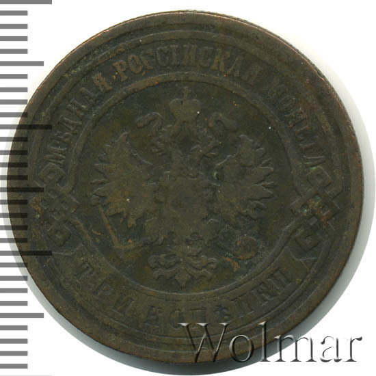 В центре монеты изображен Малый Государственный Герб Российской империи - двуглавый орел, головы которого увенчаны двумя коронами, третья, большая корона над ними. Все они соединены лентой Андрея Первозванного. В правой лапе орла – скипетр, в левой – держава. На его груди расположен Московский герб, в щите изображен Георгий Победоносец с копьем поражающий дракона. Вокруг щита цепь ордена Св. Апостола Андрея Первозванного. На крыльях орла изображены гербы: Царства Казанского, Польского, Херсонеса Таврического, Астраханского, Сибирского, Грузинского и герб соединенных княжеств Киевского, Новгородского и Владимирского — по 4 на каждое крыло. По окружности - две полукруглые плашки, соединенные узорами. На верхней плашке выпуклая надпись: "МЕДНАЯ РОССИЙСКАЯ МОНЕТА". На нижней плашке, изображенной в виде ленты, углубленная надпись: "ТРИ КОПЕЙКИ".