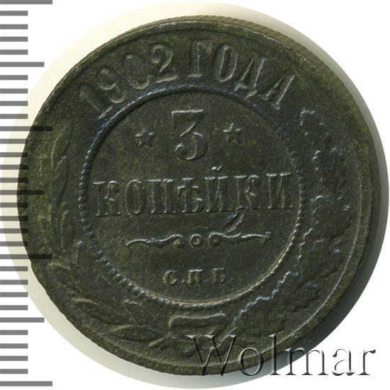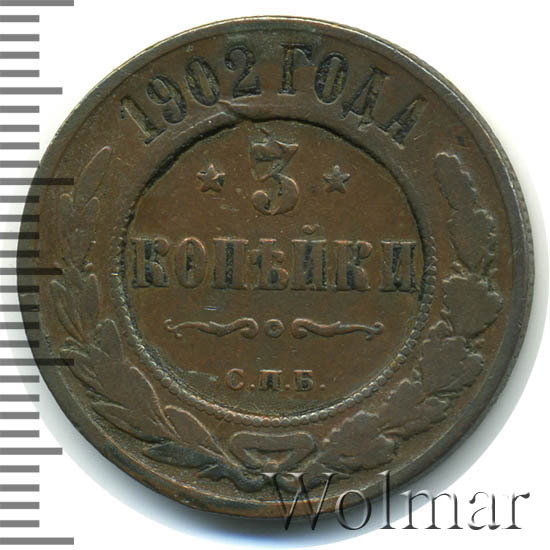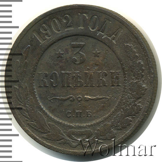 Медная монета 3 копейки 1902 года СПБ чеканилась на Санкт-Петербургском монетном дворе во времена Царствования Императора Николая II. Тираж этой монеты невелик, в отличие от тиражей монет того же номинала предыдущих лет. Тем не менее, цена этой монеты остается относительно небольшой, исключение составляют экземпляры, дошедших до наших дней практически в том же виде, в каком они были выпущены из-под пресса монетного двора - в состоянии unc. Отдельно стоит выделить монеты качества чеканки Proof - их стоимость во много раз превышает цену монет регулярного чекана.