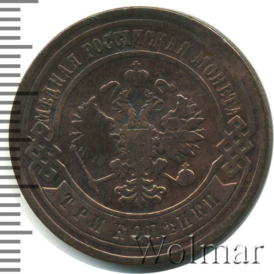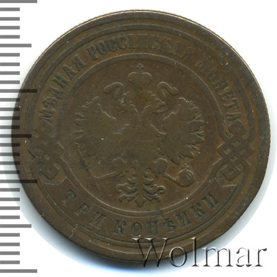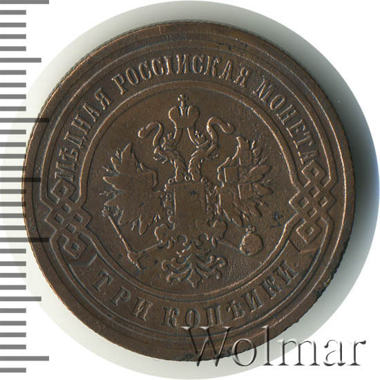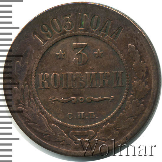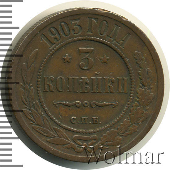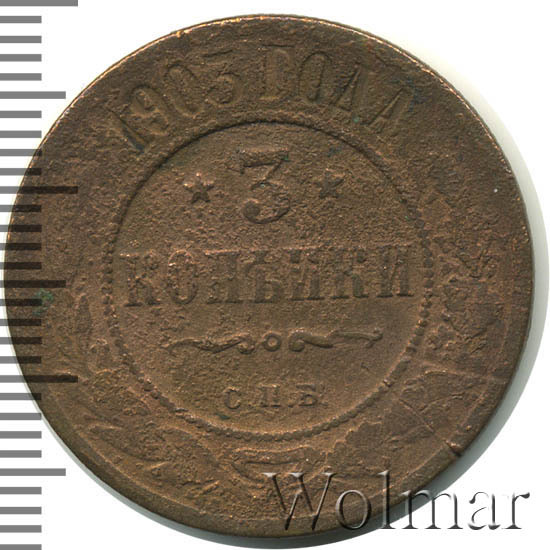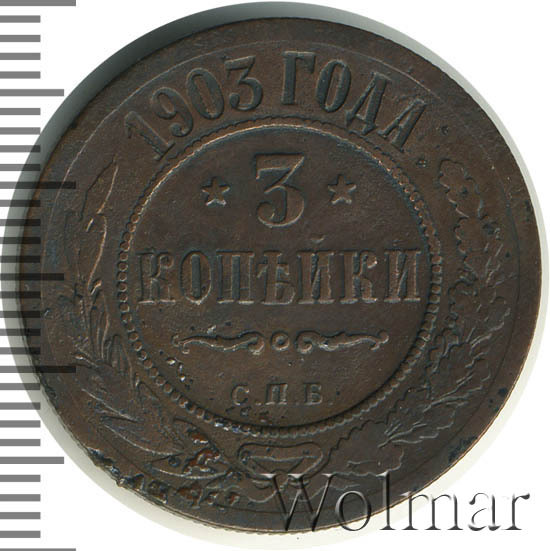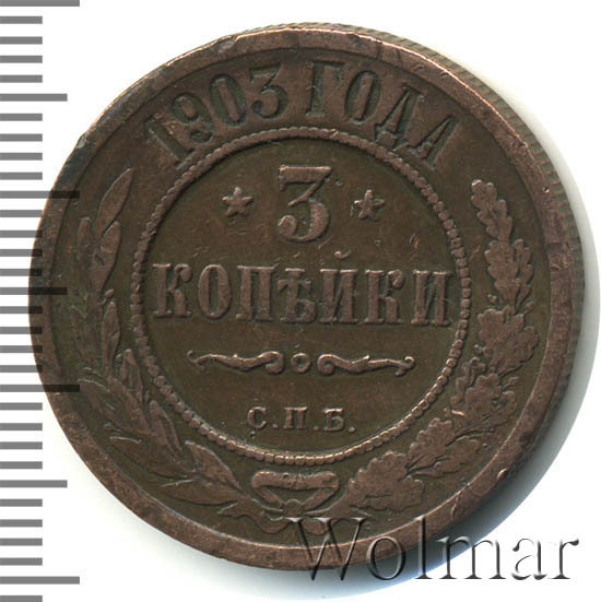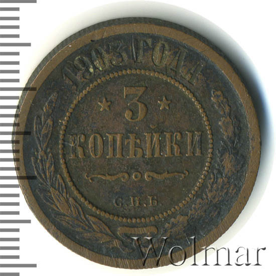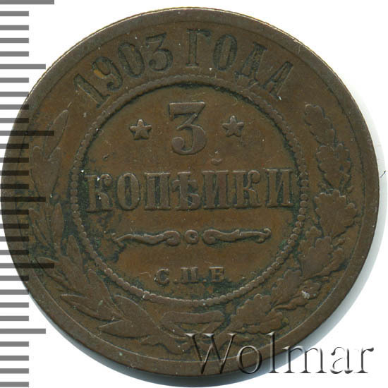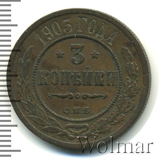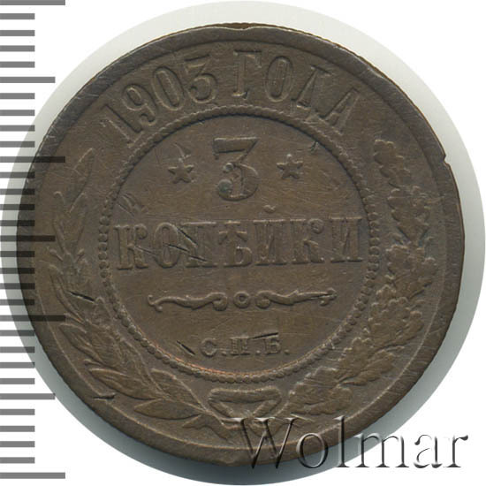 Медная монета 3 копейки 1903 года является рядовой монетой времен царствования Императора Николая II. Тираж данной монеты превышает 10 миллионов экземпляров, поэтому неудивительно что и сейчас, спустя столетие, совершенно нетрудно встретить эту монету в коллекции даже начинающего нумизмата. Но, следует иметь ввиду что монета монете рознь, даже если номинал и год выпуска одинаковые. Наиболее ценные монеты, дошедшие до наших дней в неиспорченном виде. Такие монеты имеют сохранность uncirculated. Кроме этого, для искушенных нумизматов существует монета 3 копейки 1903 года, отчеканенная специальными полированными штемпелями. Такая монета имеет качество Proof.