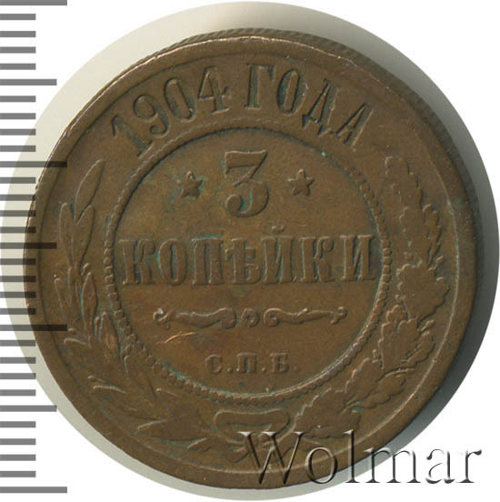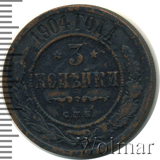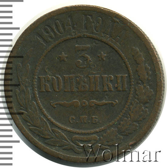 В центре указан номинал — цифра «3», ограниченная с обеих сторон звездочками. Под цифрой номинала — слово "КОПЕЙКИ". Ниже, расположен декоративный разделитель в виде двух изогнутых линий и небольшой окружности между ними. Под разделителем — обозначение монетного двора «С.П.Б.». Центральная часть отделена от остального изображения, окружностью в виде точек. В верхней части полукругом углубленная надпись: "1904 ГОДА". Ниже этой надписи, вдоль канта, изображен венок из лавровой и дубовой ветвей, которые, в нижней части, перевязаны лентой на узел бантом.