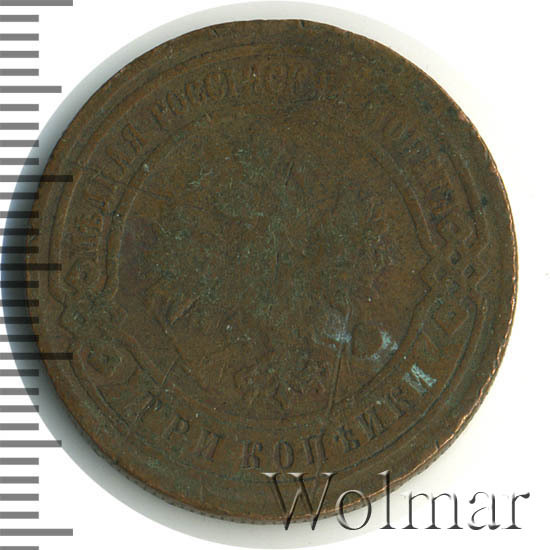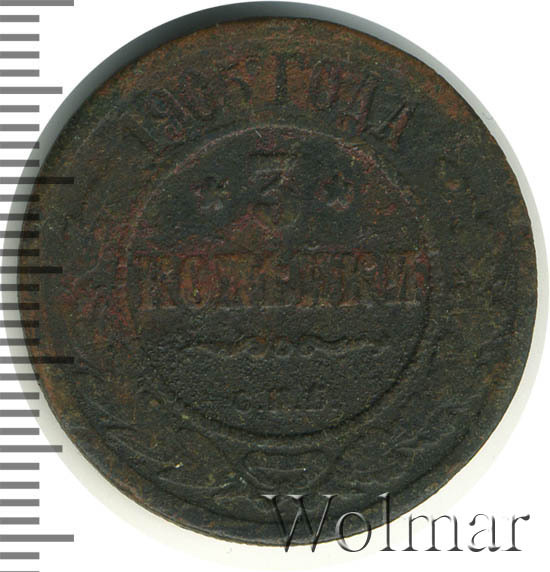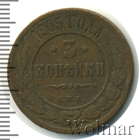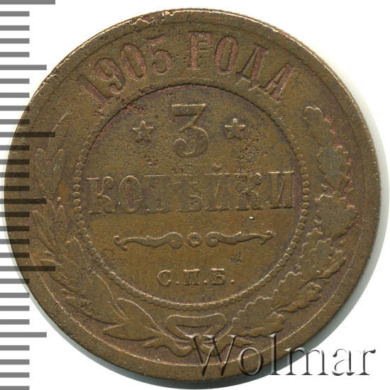 Медная монета 3 копейки 1905 года СПБ чеканилась на монетном дворе г. Санкт-Петербурга при Императоре Николае II. Это рядовая монета, которая не является редкой, за исключение экземпляров качества чеканки Proof, коих было выпущено сильно ограниченное количество. Стоит отменить что среди монет регулярного чекана самыми дорогими являются монеты, не побывавшие в обращении (UNC).