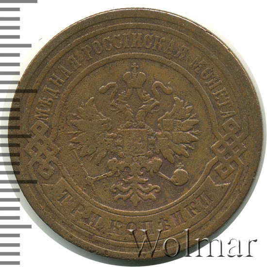 В центре монеты изображен Малый Государственный Герб Российской империи - двуглавый орел, головы которого увенчаны двумя коронами, третья, большая корона над ними. Все они соединены лентой Андрея Первозванного. В правой лапе орла – скипетр, в левой – держава. На его груди расположен Московский герб, в щите изображен Георгий Победоносец с копьем поражающий дракона. Вокруг щита цепь ордена Св. Апостола Андрея Первозванного. На крыльях орла изображены гербы: Царства Казанского, Польского, Херсонеса Таврического, Астраханского, Сибирского, Грузинского и герб соединенных княжеств Киевского, Новгородского и Владимирского — по 4 на каждое крыло. По окружности - две полукруглые плашки, соединенные узорами. На верхней плашке выпуклая надпись: "МЕДНАЯ РОССИЙСКАЯ МОНЕТА". На нижней плашке, изображенной в виде ленты, углубленная надпись: "ТРИ КОПЕЙКИ".