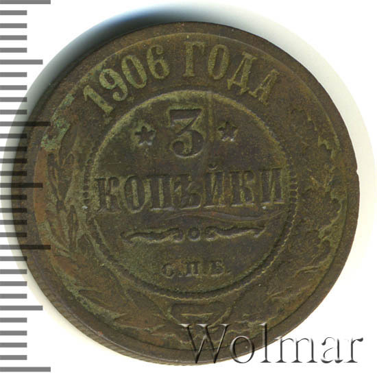 В центре указан номинал — цифра «3», ограниченная с обеих сторон звездочками. Под цифрой номинала — слово "КОПЕЙКИ". Ниже, расположен декоративный разделитель в виде двух изогнутых линий и небольшой окружности между ними. Под разделителем — обозначение монетного двора «С.П.Б.». Центральная часть отделена от остального изображения, окружностью в виде точек. В верхней части полукругом углубленная надпись: "1906 ГОДА". Ниже этой надписи, вдоль канта, изображен венок из лавровой и дубовой ветвей, которые, в нижней части, перевязаны лентой на узел бантом.