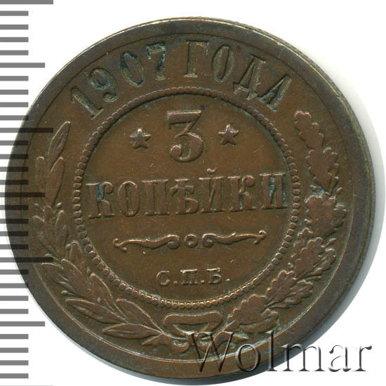В центре указан номинал — цифра «3», ограниченная с обеих сторон звездочками. Под цифрой номинала — слово "КОПЕЙКИ". Ниже, расположен декоративный разделитель в виде двух изогнутых линий и небольшой окружности между ними. Под разделителем — обозначение монетного двора «С.П.Б.». Центральная часть отделена от остального изображения, окружностью в виде точек. В верхней части полукругом углубленная надпись: "1907 ГОДА". Ниже этой надписи, вдоль канта, изображен венок из лавровой и дубовой ветвей, которые, в нижней части, перевязаны лентой на узел бантом.