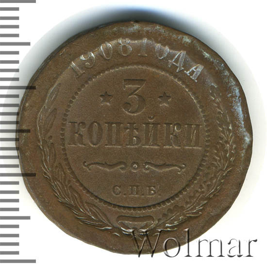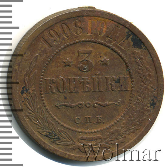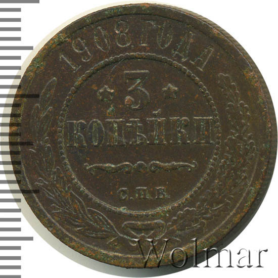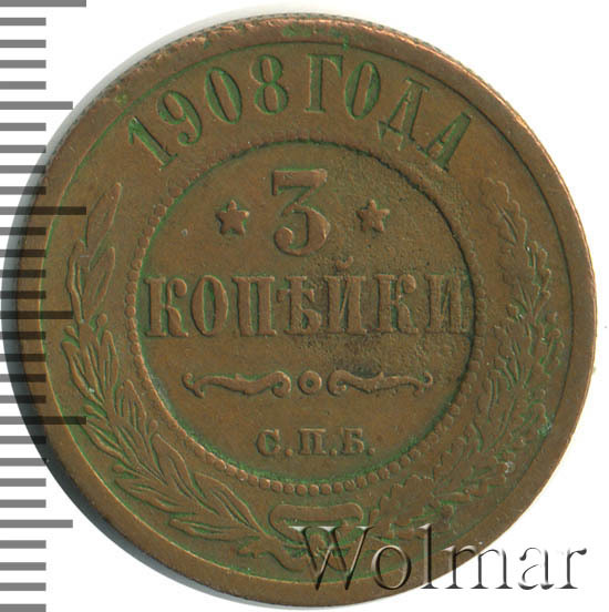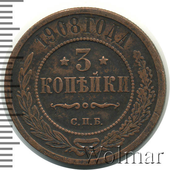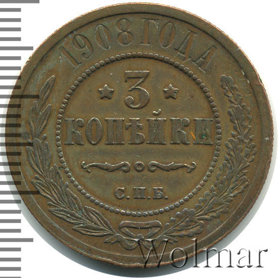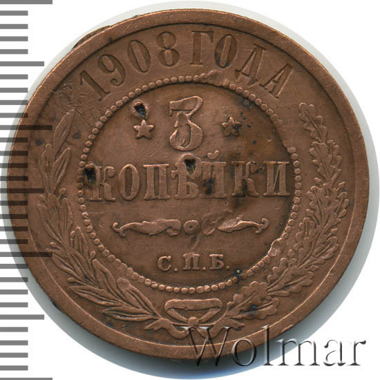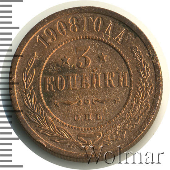 В центре указан номинал — цифра «3», ограниченная с обеих сторон звездочками. Под цифрой номинала — слово "КОПЕЙКИ". Ниже, расположен декоративный разделитель в виде двух изогнутых линий и небольшой окружности между ними. Под разделителем — обозначение монетного двора «С.П.Б.». Центральная часть отделена от остального изображения, окружностью в виде точек. В верхней части полукругом углубленная надпись: "1908 ГОДА". Ниже этой надписи, вдоль канта, изображен венок из лавровой и дубовой ветвей, которые, в нижней части, перевязаны лентой на узел бантом.