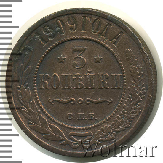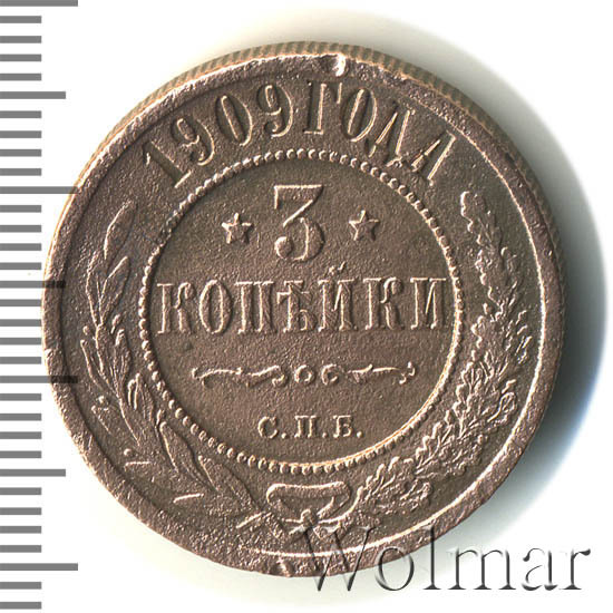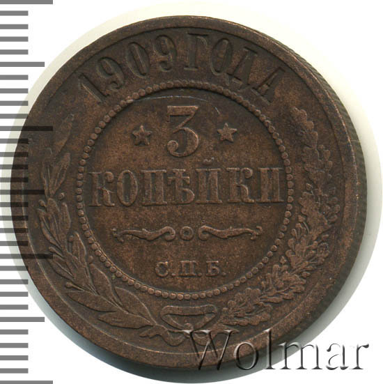 В центре указан номинал — цифра «3», ограниченная с обеих сторон звездочками. Под цифрой номинала — слово "КОПЕЙКИ". Ниже, расположен декоративный разделитель в виде двух изогнутых линий и небольшой окружности между ними. Под разделителем — обозначение монетного двора «С.П.Б.». Центральная часть отделена от остального изображения, окружностью в виде точек. В верхней части полукругом углубленная надпись: "1909 ГОДА". Ниже этой надписи, вдоль канта, изображен венок из лавровой и дубовой ветвей, которые, в нижней части, перевязаны лентой на узел бантом.