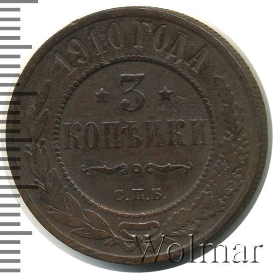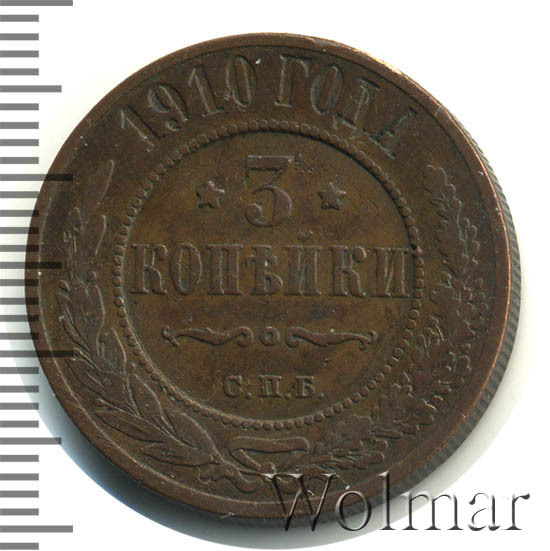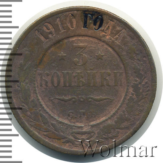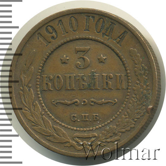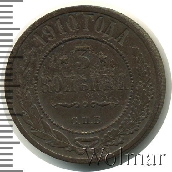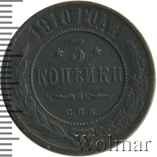Рядовая медная монета 3 копейки 1910 года СПБ чеканилась на Санкт-Петербургском монетном дворе при Императоре Николае II. Наибольшую коллекционную ценность представляют экземпляры, дошедшие до наших дней в первозданном виде, то есть те, которые имеют сохранность UNC. Кроме этого, было выпущено небольшое количество монет, отчеканенных полированными штемпелями (Proof) - такие монеты стоят во много раз больше, чем аналогичные регулярного чекана.