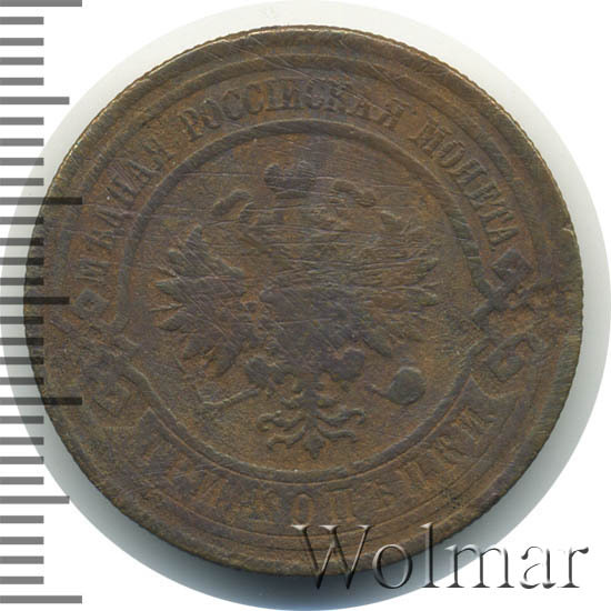 В центре монеты изображен Малый Государственный Герб Российской империи - двуглавый орел, головы которого увенчаны двумя коронами, третья, большая корона над ними. Все они соединены лентой Андрея Первозванного. В правой лапе орла – скипетр, в левой – держава. На его груди расположен Московский герб, в щите изображен Георгий Победоносец с копьем поражающий дракона. Вокруг щита цепь ордена Св. Апостола Андрея Первозванного. На крыльях орла изображены гербы: Царства Казанского, Польского, Херсонеса Таврического, Астраханского, Сибирского, Грузинского и герб соединенных княжеств Киевского, Новгородского и Владимирского — по 4 на каждое крыло. По окружности - две полукруглые плашки, соединенные узорами. На верхней плашке выпуклая надпись: "МЕДНАЯ РОССИЙСКАЯ МОНЕТА". На нижней плашке, изображенной в виде ленты, углубленная надпись: "ТРИ КОПЕЙКИ".