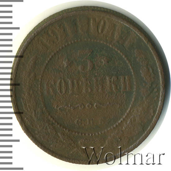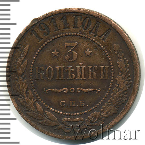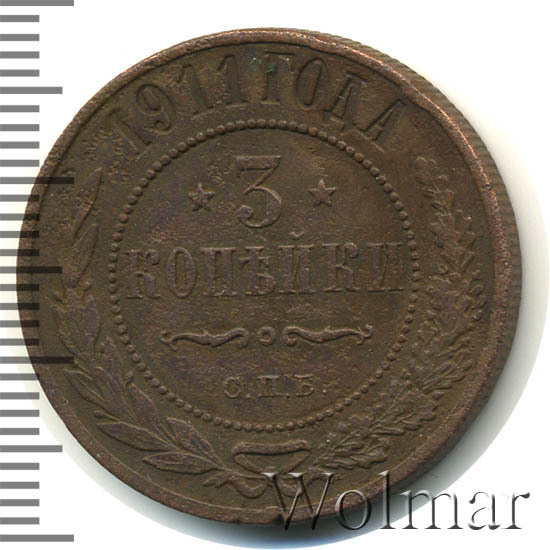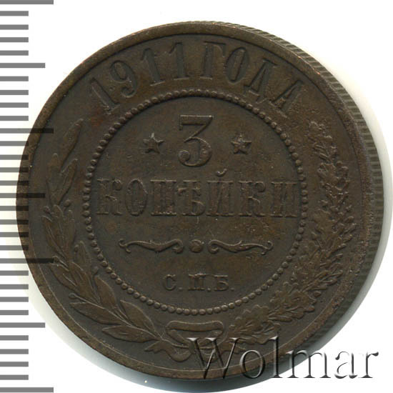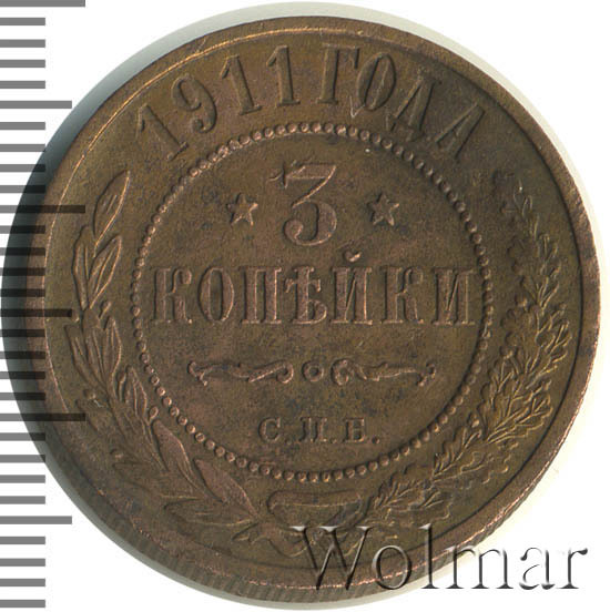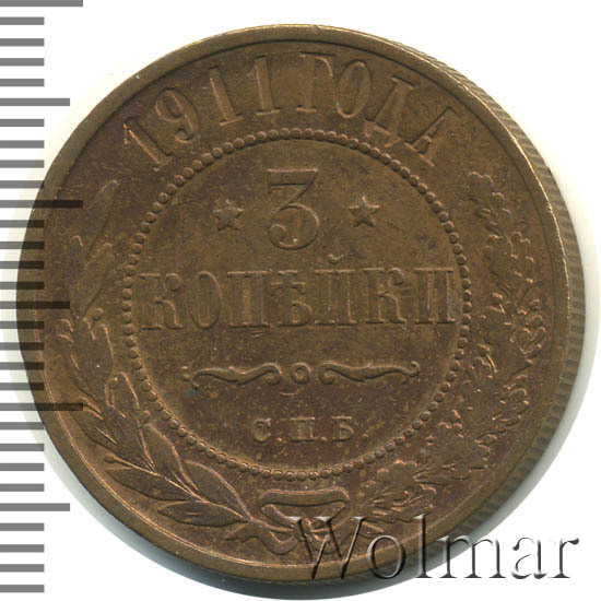 3 копейки 1911 года СПБ - рядовая разменная медная монета времен правления Императора Николая II. Эта монета была отчеканена огромным тиражом (почти 10 миллионов экземпляров), таким образом, до наших дней дошло большое количество этих монет, но не все они равноценны. Среди монет регулярного чекана самыми дорогостоящими являются наиболее сохранившиеся экземпляры - состояние UNC. Кроме этого, существуют монеты, которые чеканили специальными полированными штемпелями - Proof. Такие экземпляры стоят во много раз дороже тех же монет регулярного чекана.