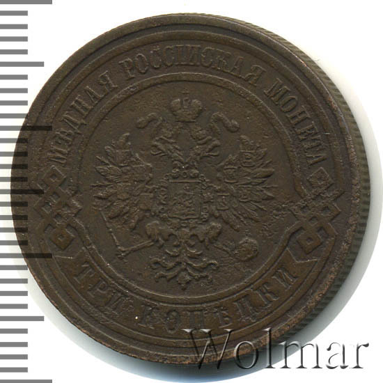 В центре монеты изображен Малый Государственный Герб Российской империи - двуглавый орел, головы которого увенчаны двумя коронами, третья, большая корона над ними. Все они соединены лентой Андрея Первозванного. В правой лапе орла – скипетр, в левой – держава. На его груди расположен Московский герб, в щите изображен Георгий Победоносец с копьем поражающий дракона. Вокруг щита цепь ордена Св. Апостола Андрея Первозванного. На крыльях орла изображены гербы: Царства Казанского, Польского, Херсонеса Таврического, Астраханского, Сибирского, Грузинского и герб соединенных княжеств Киевского, Новгородского и Владимирского — по 4 на каждое крыло. По окружности - две полукруглые плашки, соединенные узорами. На верхней плашке выпуклая надпись: "МЕДНАЯ РОССИЙСКАЯ МОНЕТА". На нижней плашке, изображенной в виде ленты, углубленная надпись: "ТРИ КОПЕЙКИ".