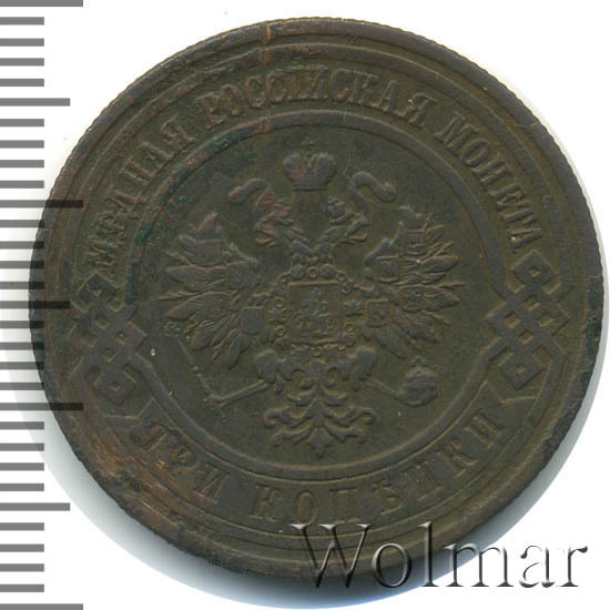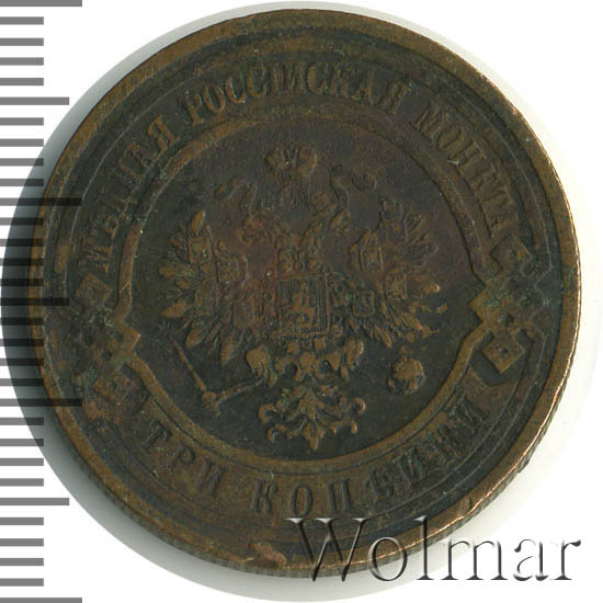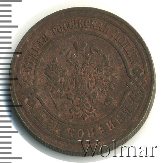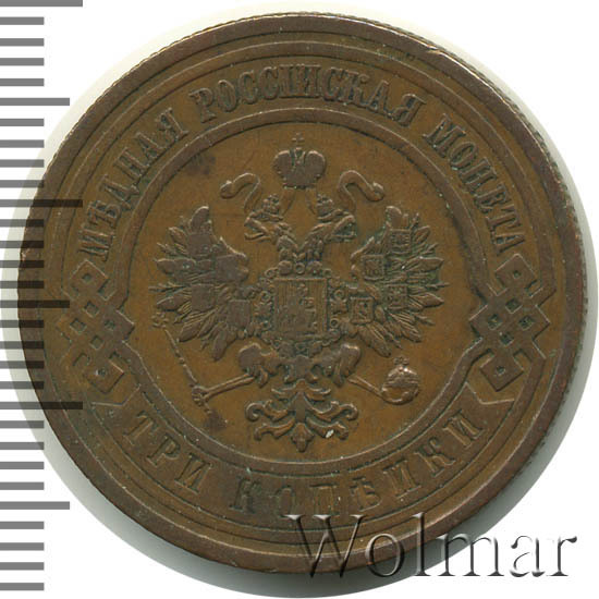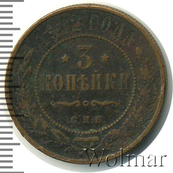 Типичная медная монета достоинством 3 копейки. Чеканилась на монетном дворе г. Санкт-Петербурга, о чем говорят буквы "СПБ" на реверсе монеты. Всего было выпущено 8,5 миллионов экземпляров. Нетрудно догадаться, что из этих миллионов до наших дней дожило весомое количество данных монет. Таким образом, поскольку встречается монета часто, ее цена небольшая. Достаточно дорогими могут быть экземпляры в состоянии анциркулейтед. Самой дорогой является данная монета качества Proof.