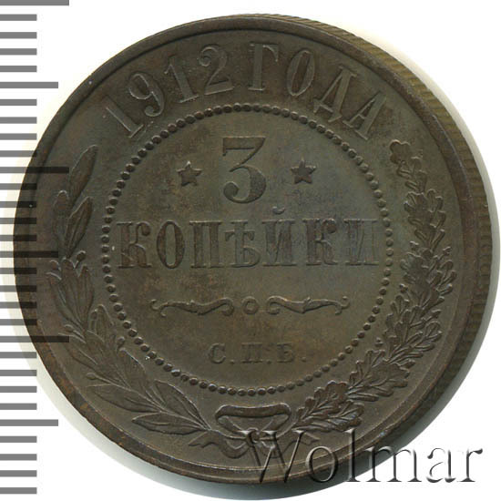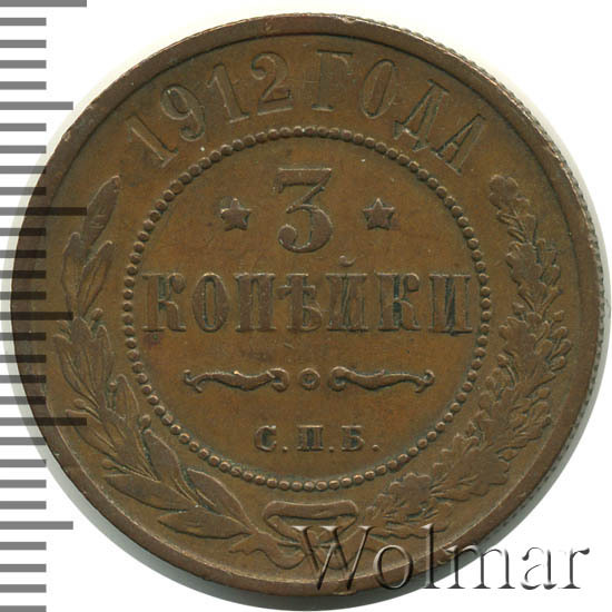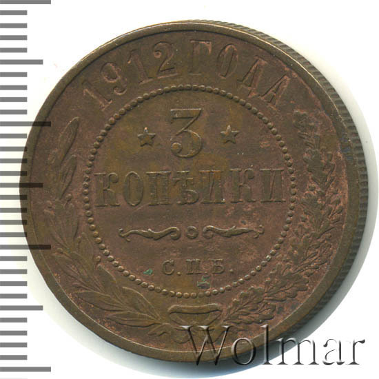 В центре указан номинал — цифра «3», ограниченная с обеих сторон звездочками. Под цифрой номинала — слово "КОПЕЙКИ". Ниже, расположен декоративный разделитель в виде двух изогнутых линий и небольшой окружности между ними. Под разделителем — обозначение монетного двора «С.П.Б.». Центральная часть отделена от остального изображения, окружностью в виде точек. В верхней части полукругом углубленная надпись: "1912 ГОДА". Ниже этой надписи, вдоль канта, изображен венок из лавровой и дубовой ветвей, которые, в нижней части, перевязаны лентой на узел бантом.