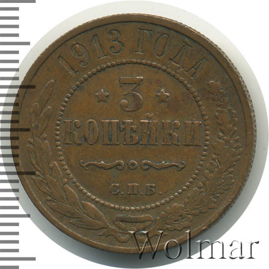Медная разменная монета 3 копейки 1913 года отчеканена громадным тиражом (почти в два раза превосходит тираж 3 копеек 1912 года). Кроме того, монеты этого года недолго успели побывать в обращении до 1917 года, когда все монеты этих лет были изъяты из оборота, таким образом до наших дней дошло большое количество экземпляров в состоянии UNC, а значит и цена на них небольшая. Самыми дорогими монетами данного номинала и года являются Proof-экземпляры.