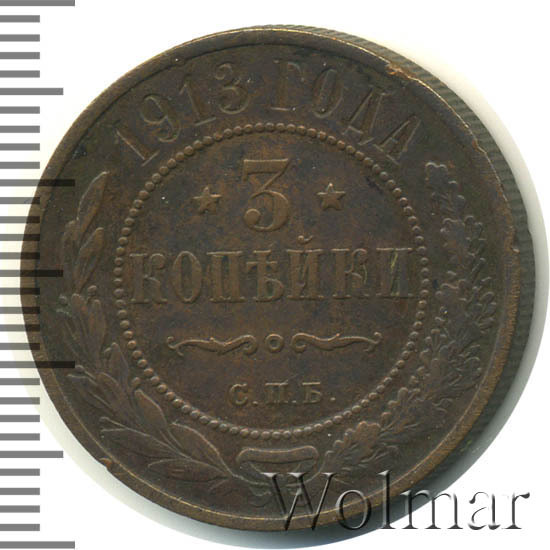 В центре указан номинал — цифра «3», ограниченная с обеих сторон звездочками. Под цифрой номинала — слово "КОПЕЙКИ". Ниже, расположен декоративный разделитель в виде двух изогнутых линий и небольшой окружности между ними. Под разделителем — обозначение монетного двора «С.П.Б.». Центральная часть отделена от остального изображения, окружностью в виде точек. В верхней части полукругом углубленная надпись: "1913 ГОДА". Ниже этой надписи, вдоль канта, изображен венок из лавровой и дубовой ветвей, которые, в нижней части, перевязаны лентой на узел бантом.