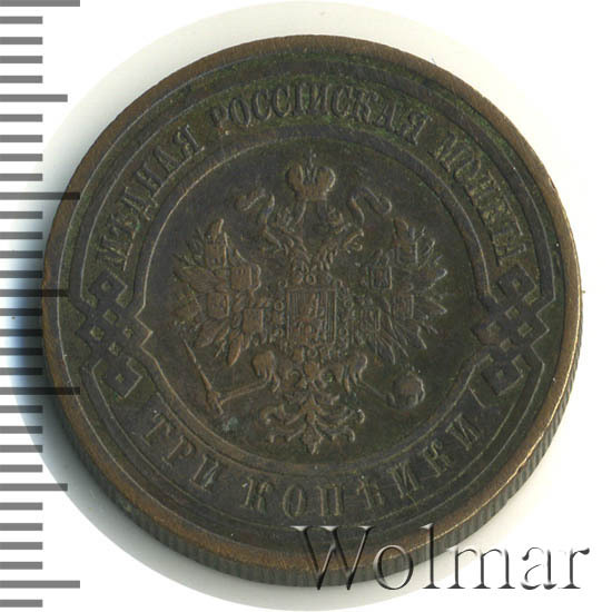 В центре монеты изображен Малый Государственный Герб Российской империи - двуглавый орел, головы которого увенчаны двумя коронами, третья, большая корона над ними. Все они соединены лентой Андрея Первозванного. В правой лапе орла – скипетр, в левой – держава. На его груди расположен Московский герб, в щите изображен Георгий Победоносец с копьем поражающий дракона. Вокруг щита цепь ордена Св. Апостола Андрея Первозванного. На крыльях орла изображены гербы: Царства Казанского, Польского, Херсонеса Таврического, Астраханского, Сибирского, Грузинского и герб соединенных княжеств Киевского, Новгородского и Владимирского — по 4 на каждое крыло. По окружности - две полукруглые плашки, соединенные узорами. На верхней плашке выпуклая надпись: "МЕДНАЯ РОССИЙСКАЯ МОНЕТА". На нижней плашке, изображенной в виде ленты, углубленная надпись: "ТРИ КОПЕЙКИ".