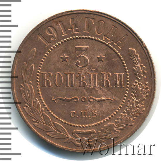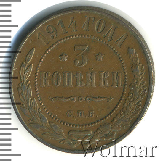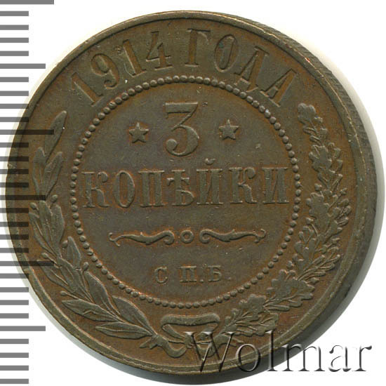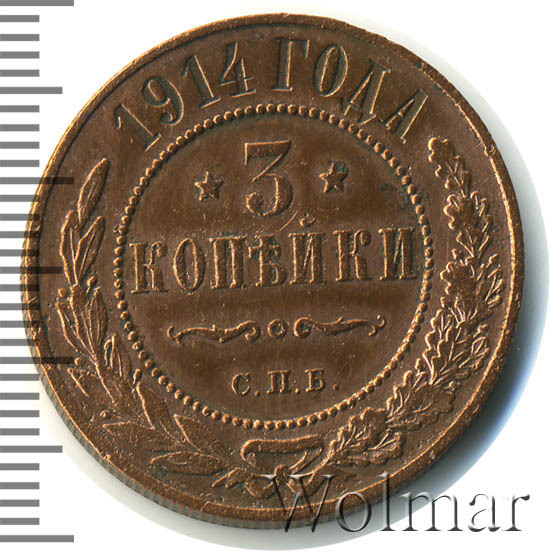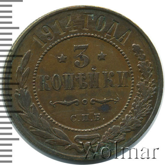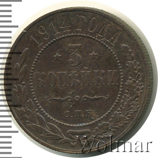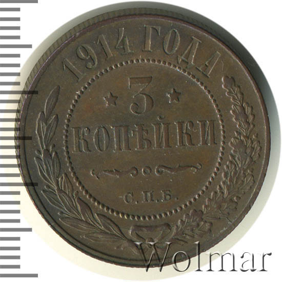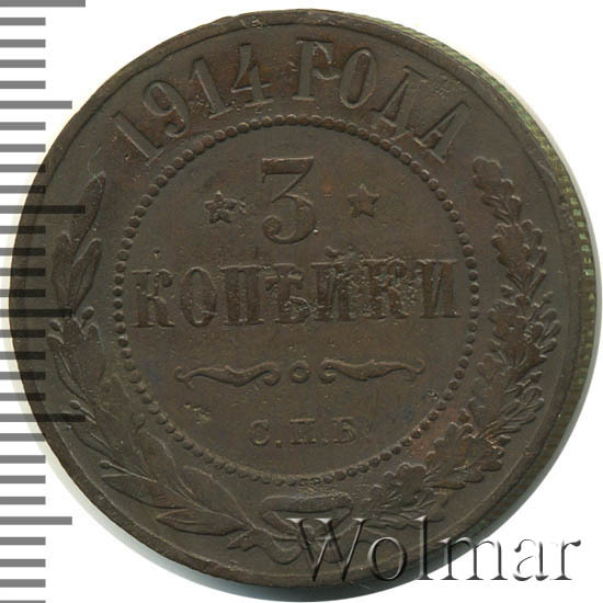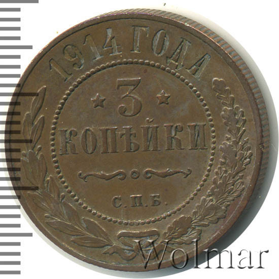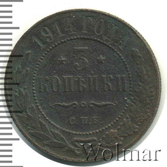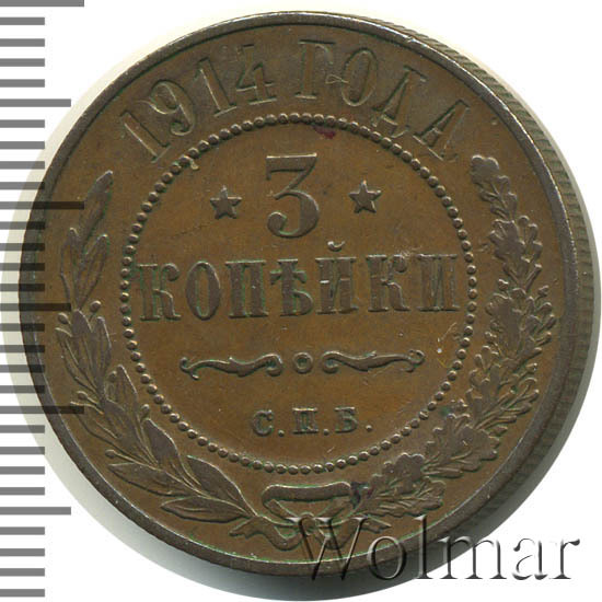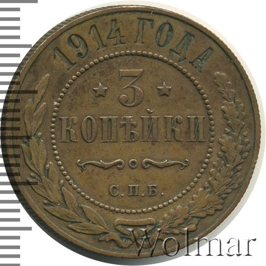 В центре указан номинал — цифра «3», ограниченная с обеих сторон звездочками. Под цифрой номинала — слово "КОПЕЙКИ". Ниже, расположен декоративный разделитель в виде двух изогнутых линий и небольшой окружности между ними. Под разделителем — обозначение монетного двора «С.П.Б.». Центральная часть отделена от остального изображения, окружностью в виде точек. В верхней части полукругом углубленная надпись: "1914 ГОДА". Ниже этой надписи, вдоль канта, изображен венок из лавровой и дубовой ветвей, которые, в нижней части, перевязаны лентой на узел бантом.