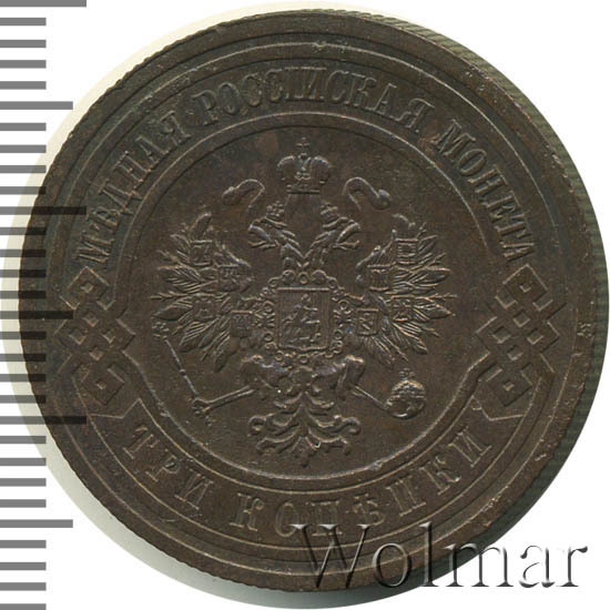 В центре монеты изображен Малый Государственный Герб Российской империи - двуглавый орел, головы которого увенчаны двумя коронами, третья, большая корона над ними. Все они соединены лентой Андрея Первозванного. В правой лапе орла – скипетр, в левой – держава. На его груди расположен Московский герб, в щите изображен Георгий Победоносец с копьем поражающий дракона. Вокруг щита цепь ордена Св. Апостола Андрея Первозванного. На крыльях орла изображены гербы: Царства Казанского, Польского, Херсонеса Таврического, Астраханского, Сибирского, Грузинского и герб соединенных княжеств Киевского, Новгородского и Владимирского — по 4 на каждое крыло. По окружности - две полукруглые плашки, соединенные узорами. На верхней плашке выпуклая надпись: "МЕДНАЯ РОССИЙСКАЯ МОНЕТА". На нижней плашке, изображенной в виде ленты, углубленная надпись: "ТРИ КОПЕЙКИ".