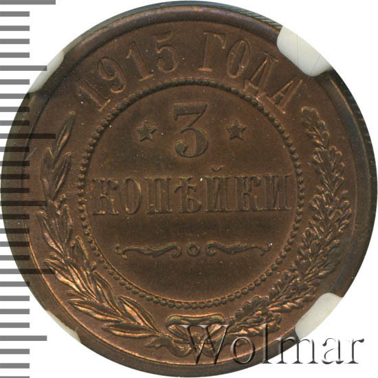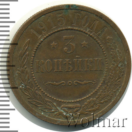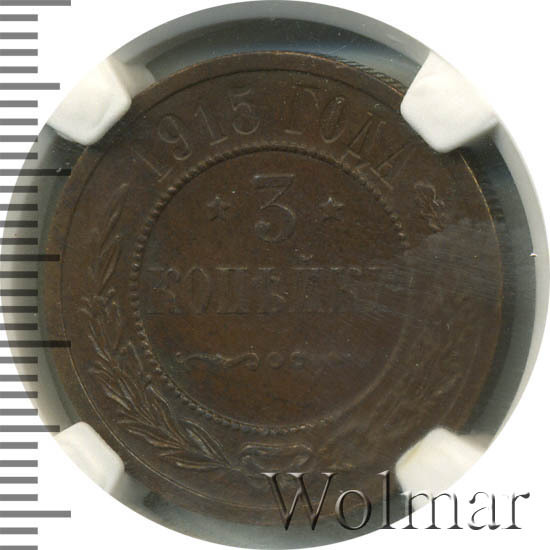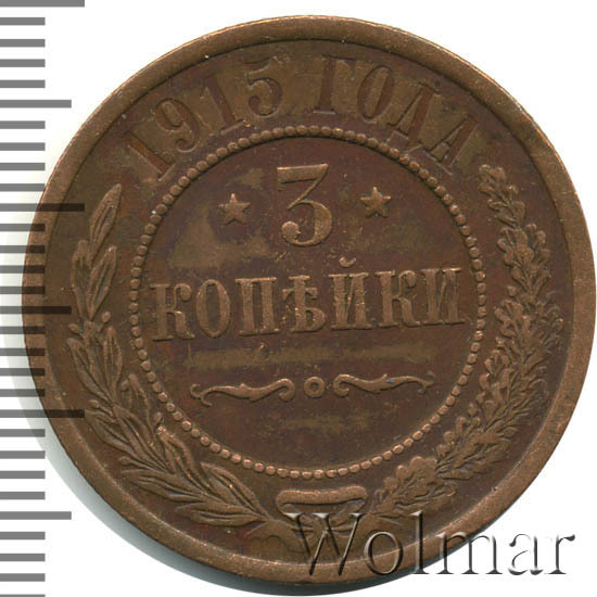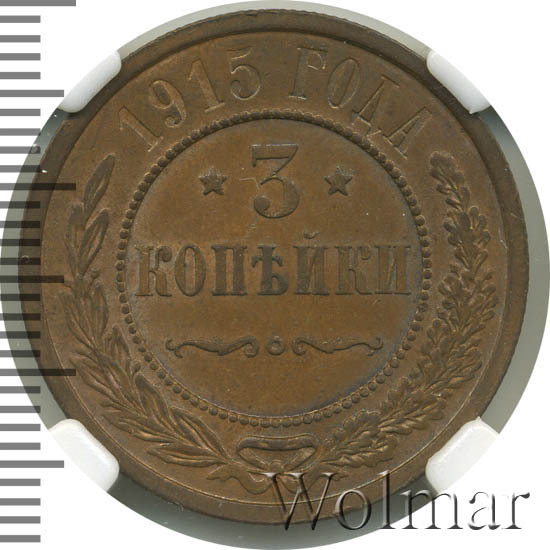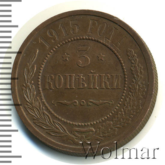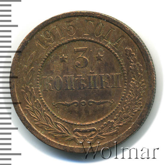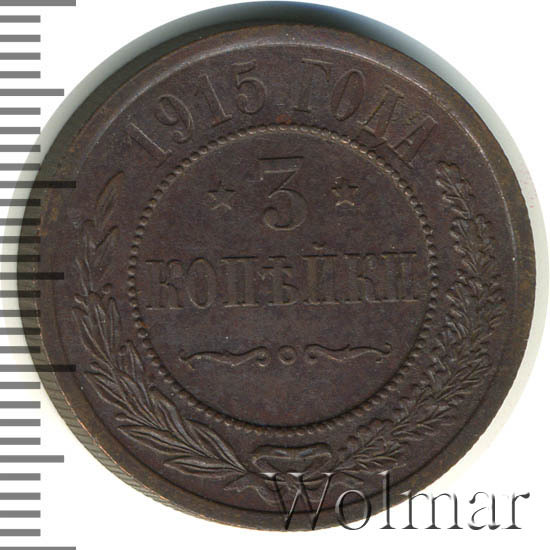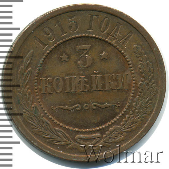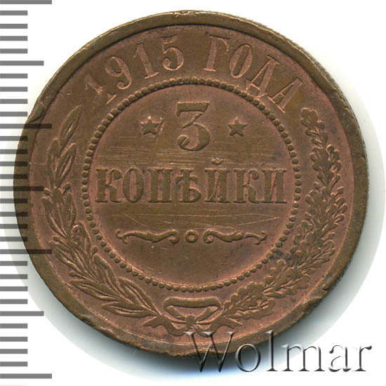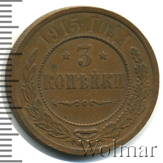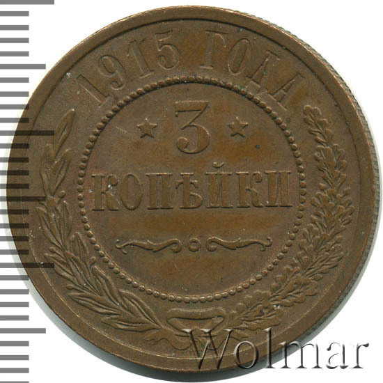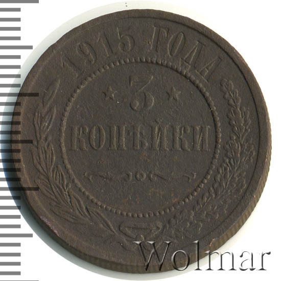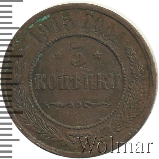 Дата на монете соответствует периоду Первой Мировой Войны. Не смотря на активные боевые действия со стороны Российской Империи, тираж медных монет этого года был одним из самых больших за последние 20 лет. Для 3 копеек 1915 года характерно отсутствие букв "СПБ" на реверсе. Это связано с переименованием Санкт-Петербурга в Петроград. Найти такую монету не составляет большого труда даже в сохранности UNC. Несколько сложнее обстоят дела с пруф-монетами. Данный тип монеты в неизменном виде чеканился с 1867 года, начиная с правления Александра II и до революции 1917 года. Ниже представлены последние проходы аукционов по монете 3 копейки 1915 года, которые помогут сориентироваться по стоимости монеты.