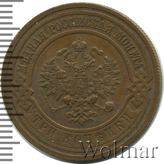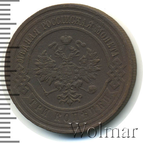В центре монеты изображен Малый Государственный Герб Российской империи - двуглавый орел, головы которого увенчаны двумя коронами, третья, большая корона над ними. Все они соединены лентой Андрея Первозванного. В правой лапе орла – скипетр, в левой – держава. На его груди расположен Московский герб, в щите изображен Георгий Победоносец с копьем поражающий дракона. Вокруг щита цепь ордена Св. Апостола Андрея Первозванного. На крыльях орла изображены гербы: Царства Казанского, Польского, Херсонеса Таврического, Астраханского, Сибирского, Грузинского и герб соединенных княжеств Киевского, Новгородского и Владимирского — по 4 на каждое крыло. По окружности - две полукруглые плашки, соединенные узорами. На верхней плашке выпуклая надпись: "МЕДНАЯ РОССИЙСКАЯ МОНЕТА". На нижней плашке, изображенной в виде ленты, углубленная надпись: "ТРИ КОПЕЙКИ".