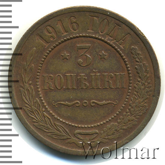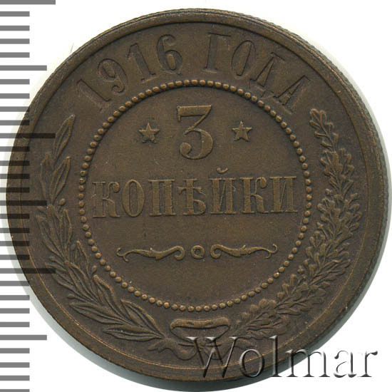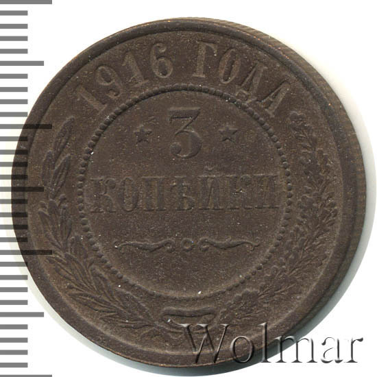 Тираж монеты 3 копейки 1916 года самый большой из всех монет достоинством 3 копейки времен правления Николая II. Отличительной особенностью, так же как и 3 копеек 1915 года является отсутствие букв на реверсе монеты. Это связано с переименованием Санкт-Петербурга в Петроград. Эта монета находилась в обращении совсем недолго, до 1917 года, когда царские монеты были изъяты из обращении. В связи с огромным тиражом и недолгим периодом обращения, найти 3 копейки 1916 года даже в сохранности UNC совсем несложно, а значит и цена не нее небольшая. Самыми дорогими являются экземпляры качества чеканки Proof,
