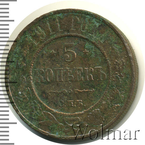 В центре указан номинал — цифра «5», ограниченная с обеих сторон звездочками. Под цифрой номинала — слово "КОПЕЕК". Ниже, расположен декоративный разделитель в виде двух изогнутых линий и небольшой окружности между ними. Под разделителем — обозначение монетного двора «С.П.Б.». Центральная часть отделена от остального изображения, окружностью в виде точек. В верхней части полукругом углубленная надпись: "1911 ГОДА". Вдоль канта изображен венок из лавровой и дубовой ветвей, которые, в нижней части, перевязаны лентой на узел бантом.