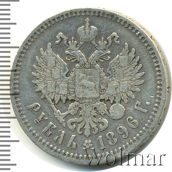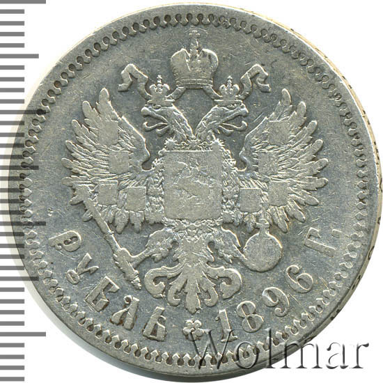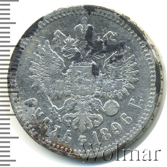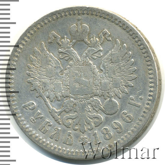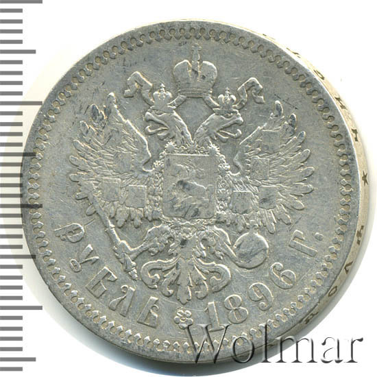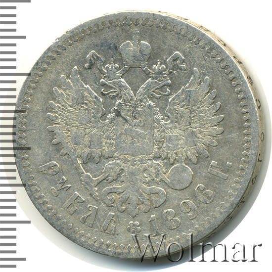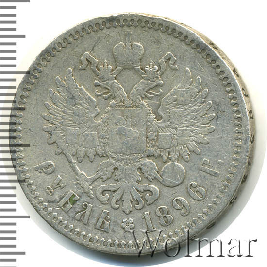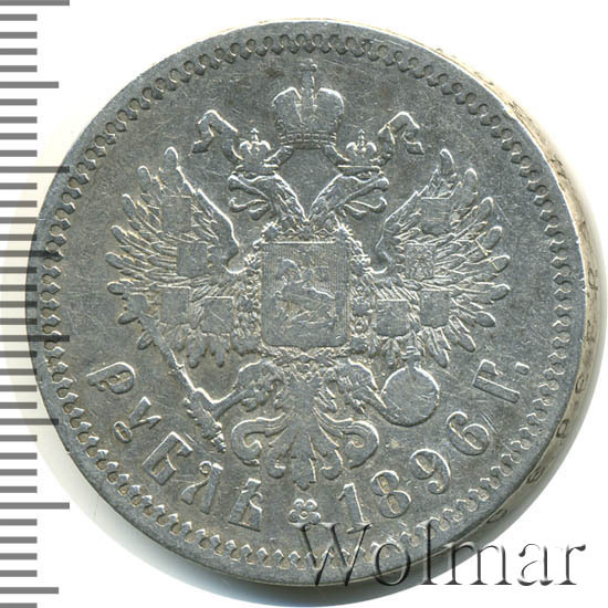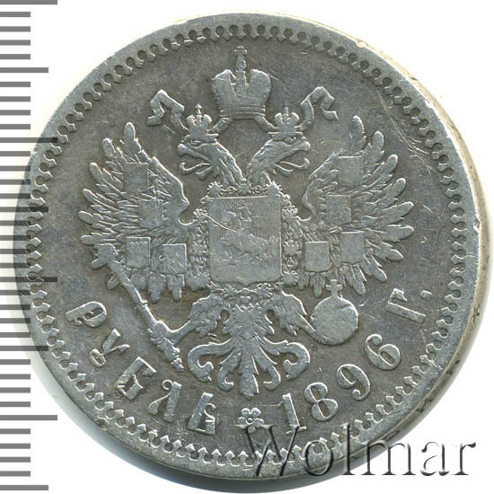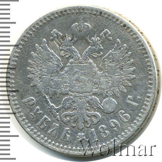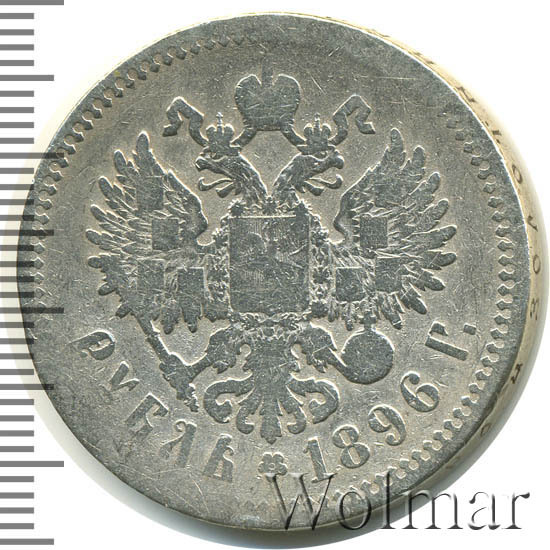 Рубль Николая II 1896 года чеканился из сплава серебра 900 пробы и весил ровно 20 грамм. Украшает гурт и защищает эту красивую монету от подделки надпись славянским шрифтом: "чистаго серебра 4 золотника 21 доля". Известна Парижская чеканка, обозначавшаяся (*) звёздочкой на гуртовой надписи тиражом около 12 миллионов экземпляров. Существуют очень редкие парижские рубли с неправильной соосностью сторон в 180 градусов. У рублей 1896 года чеканенных в Петербурге на гурте стоит знак начальника монетного двора или минцмейстера, вдавленные инициалы А.Г - Аполлон Грасгоф. Стоимость 1 рубля 1896 года не большая для подобных монет, но всё зависит от состояния оцениваемого экземпляра. Рубли с штемпельным блеском стоят в десятки раз дороже монет в обычном состоянии.